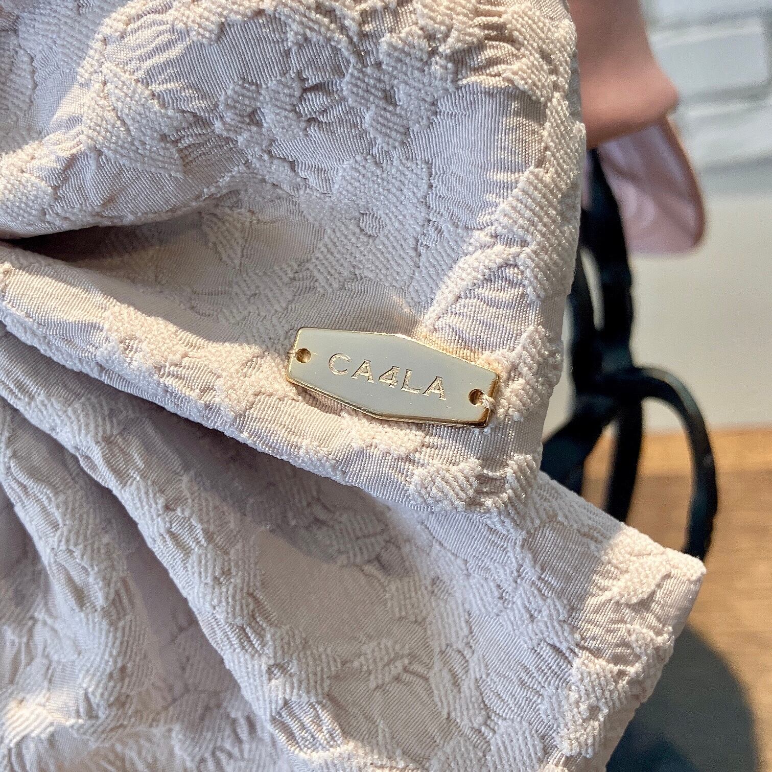 後ろのゴム部分に大きなリボンを飾り付け。キラリと輝くCA4LAロゴプレートも、さり気ないアクセントに。