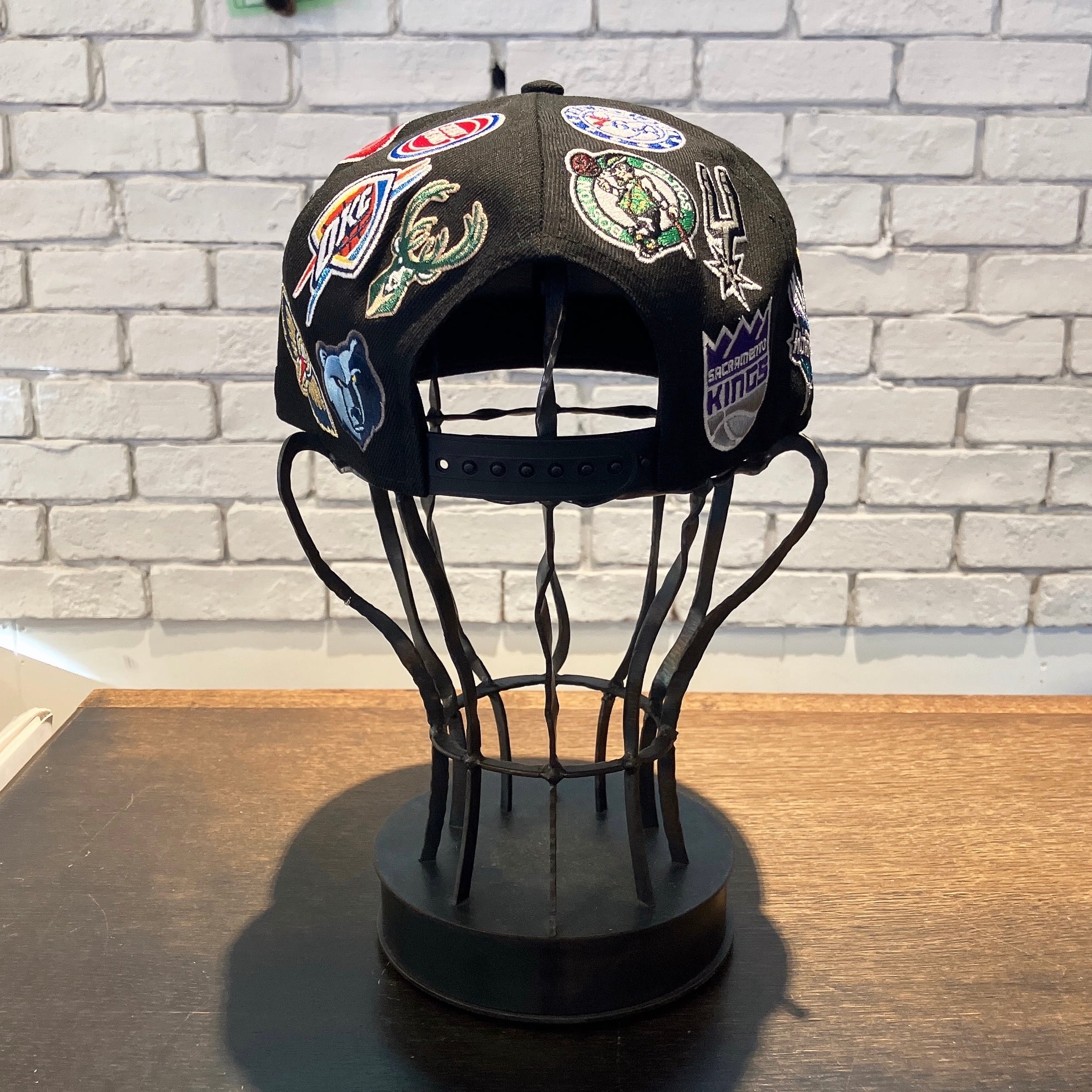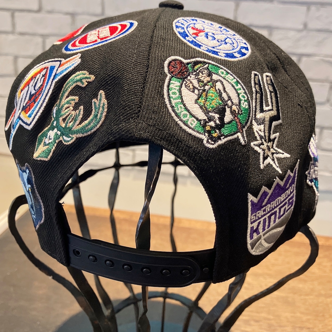 NBA球団ロゴがクラウンとブリム全面に刺繍されたキャップ。