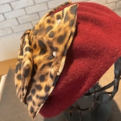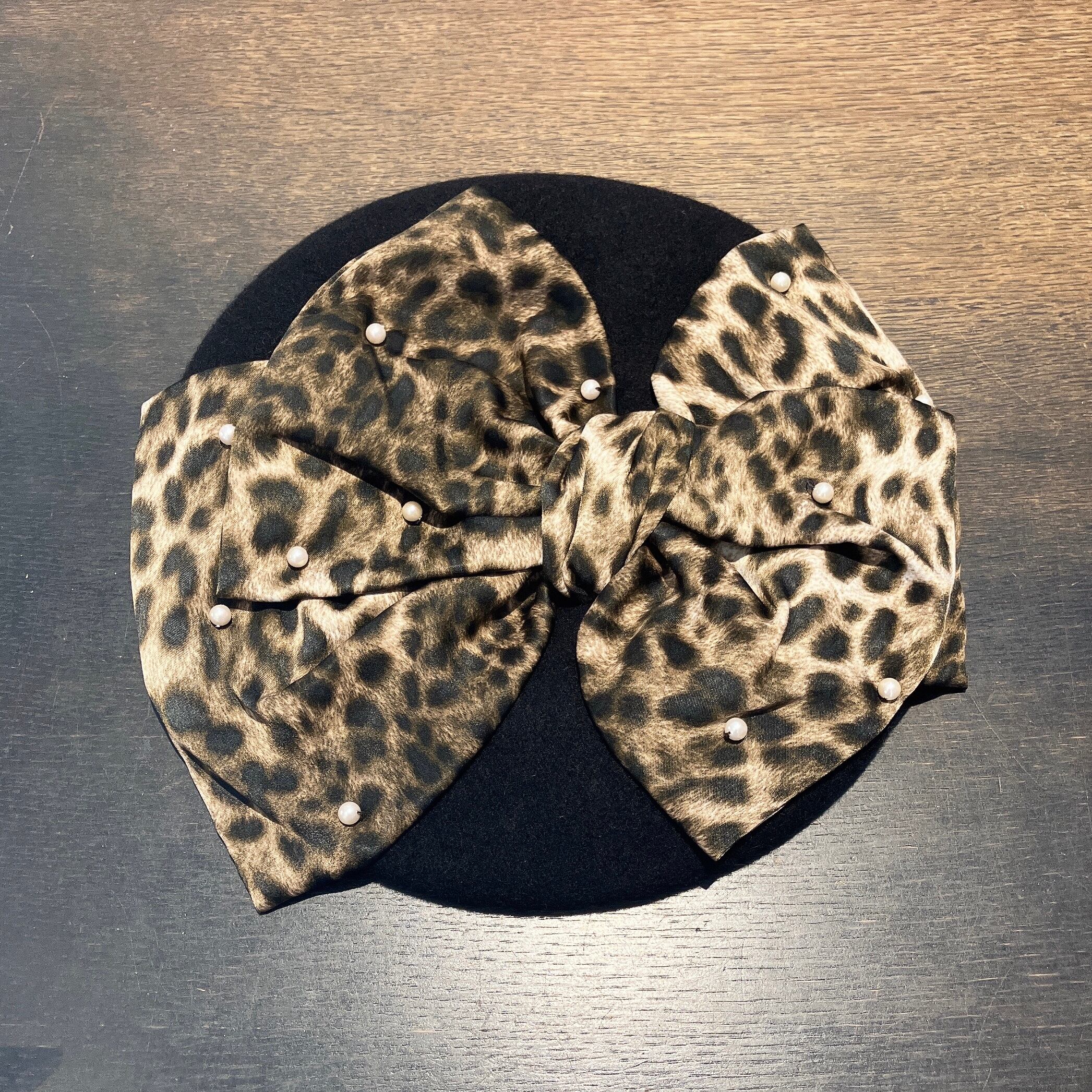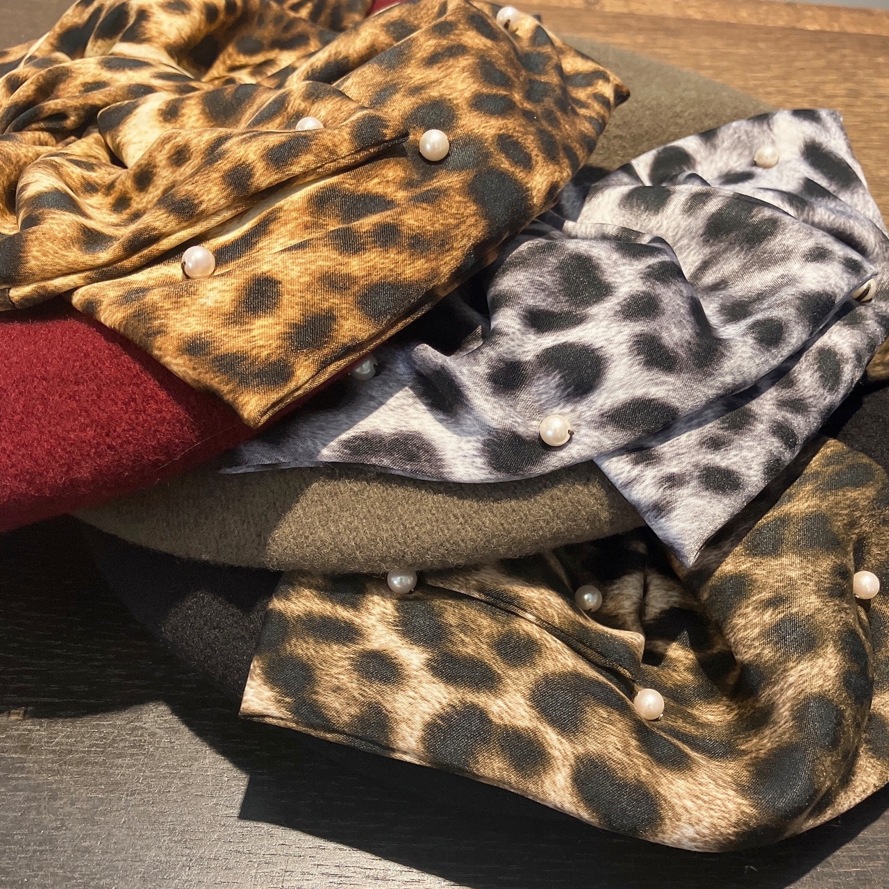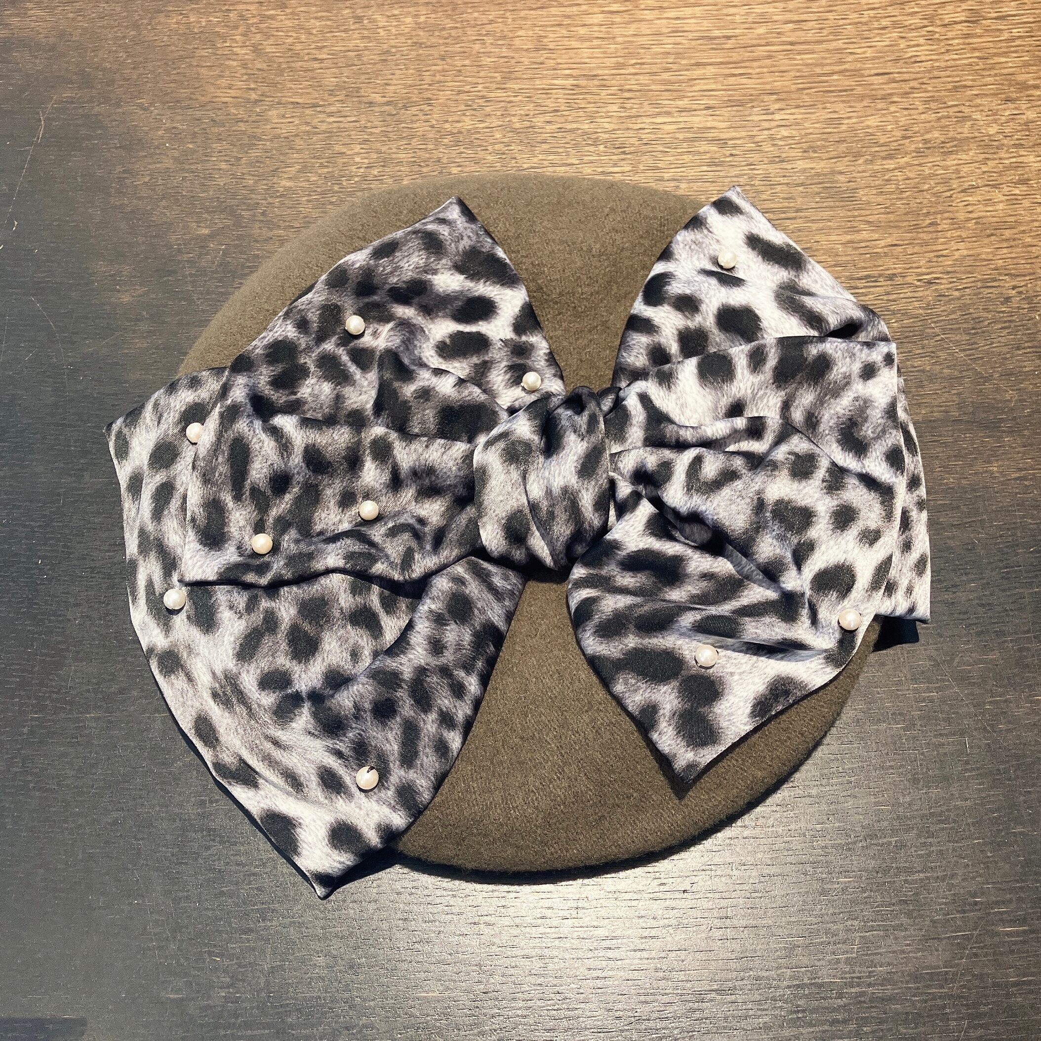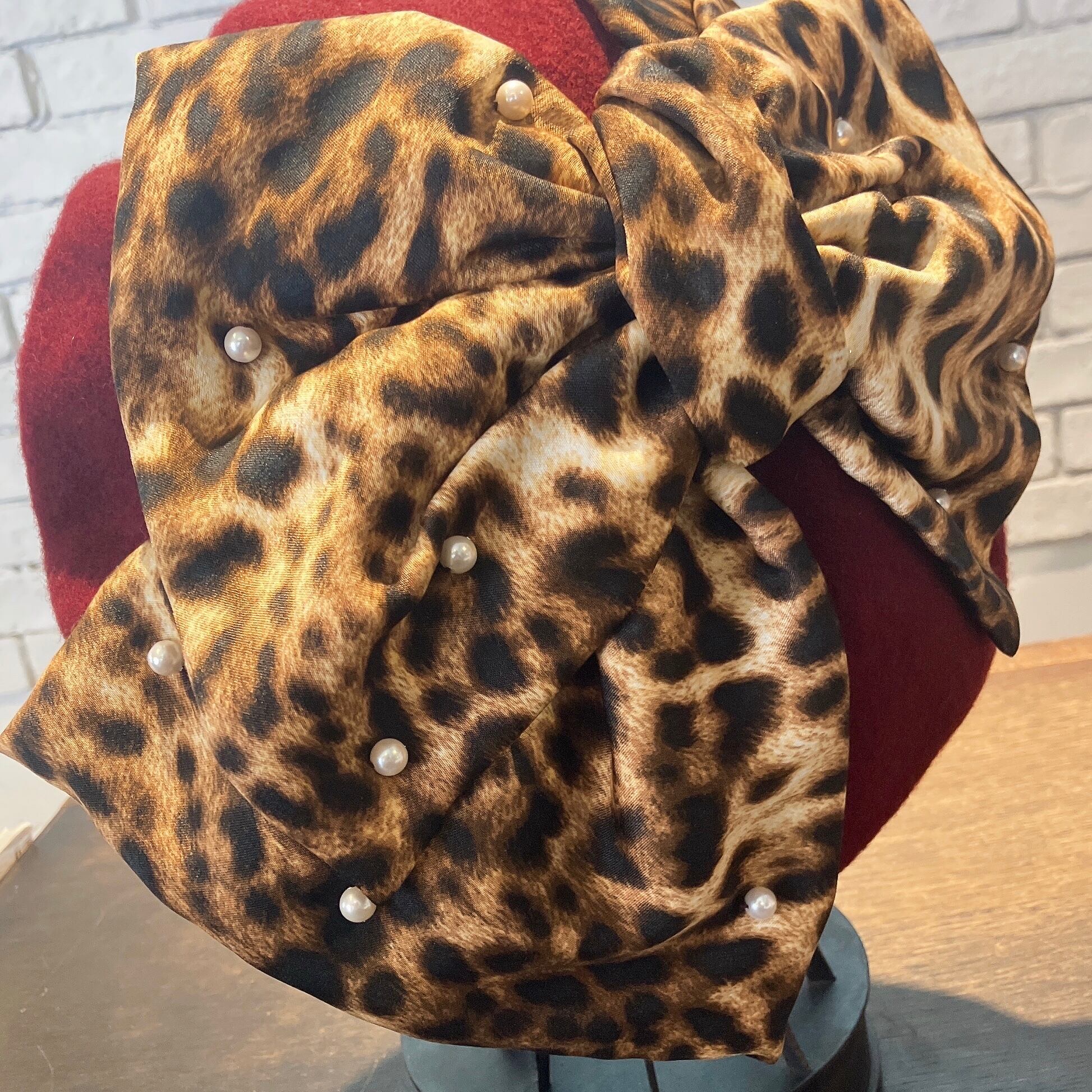 こちらはほんのり光沢がありさらさらした手触りのヒョウ柄。後頭部を立体的に覆い存在感はありますが、リボンを立たせず寝かせるデザインで大人っぽい落ち着いた服装にも上品にマッチします。全体に散りばめられたパールビーズがアクセント。