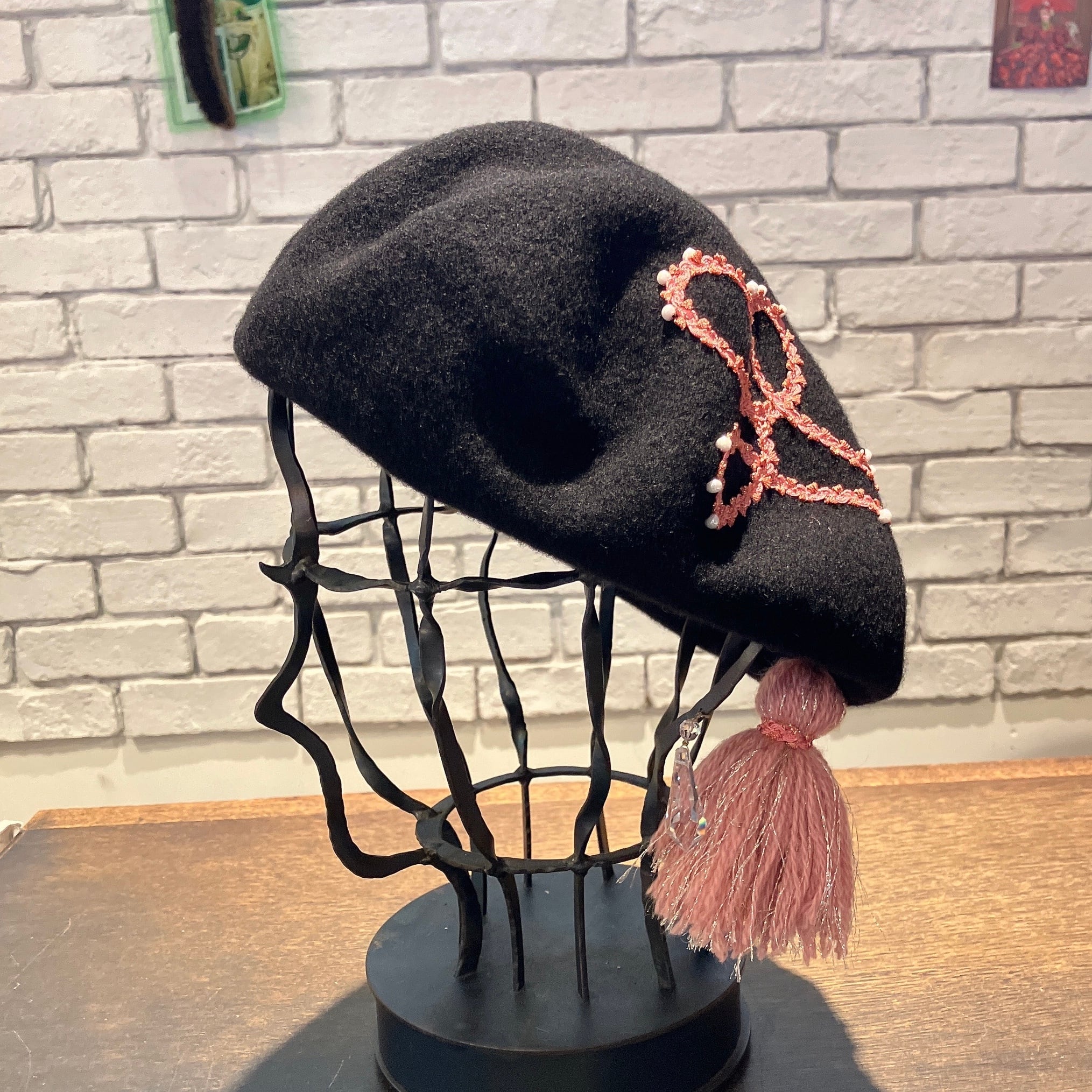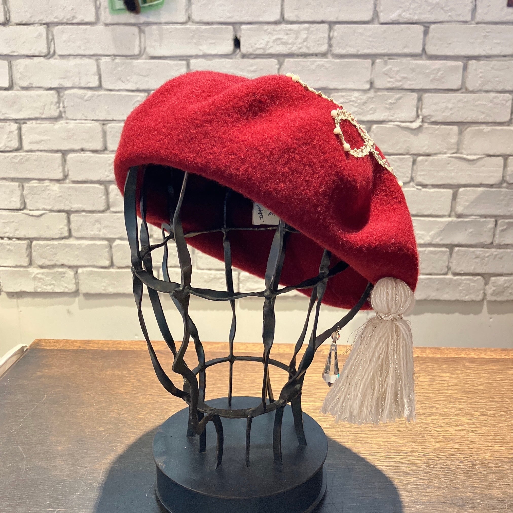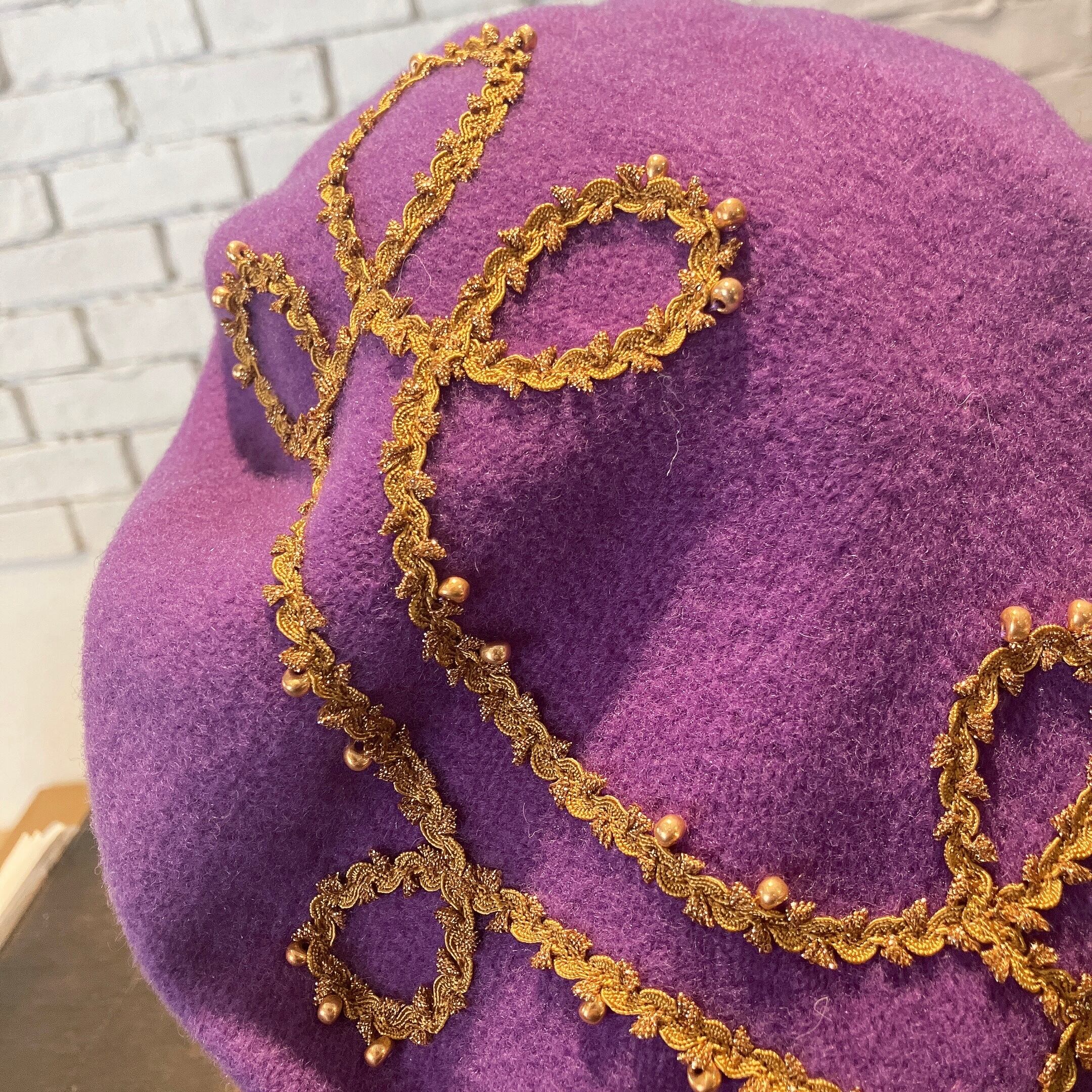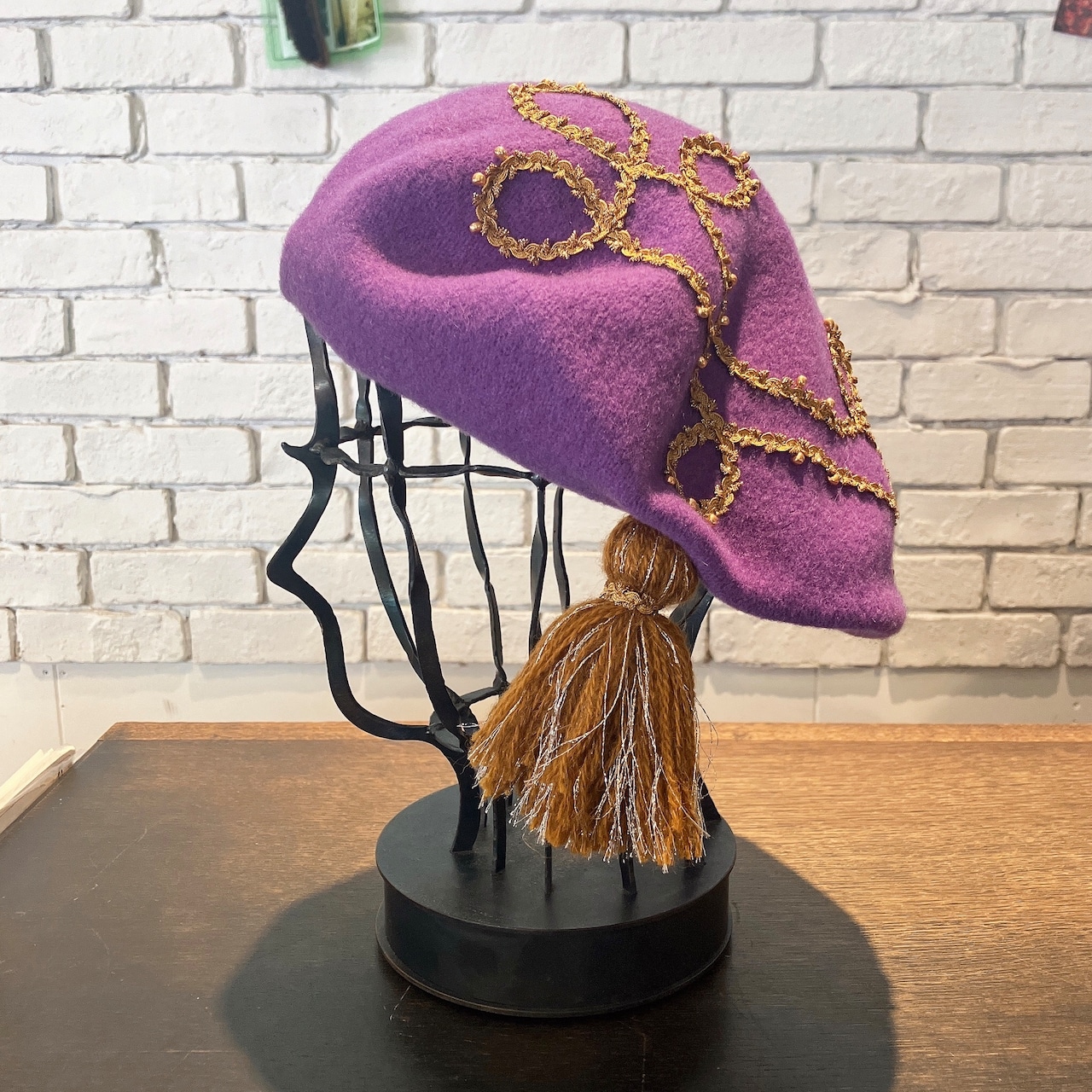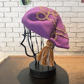 少し大ぶりのバスクベレーにラメ入りのブレードをコードのようなお洒落なデザインにたたき付け、同じブレードを巻いたラメ糸たっぷりの大きなタッセルを飾ってあります。ブレード部分にあしらわれたビーズもアクセント。
