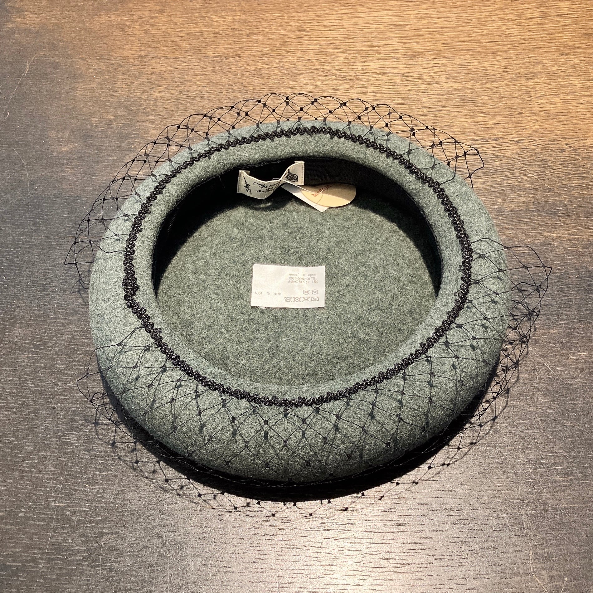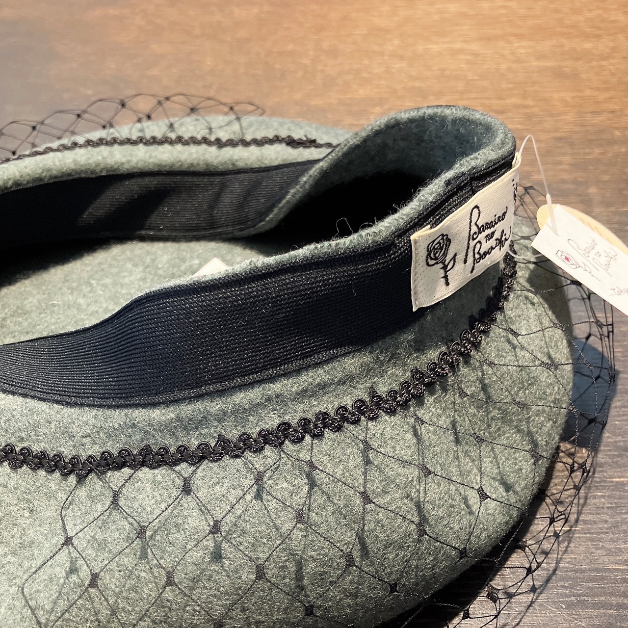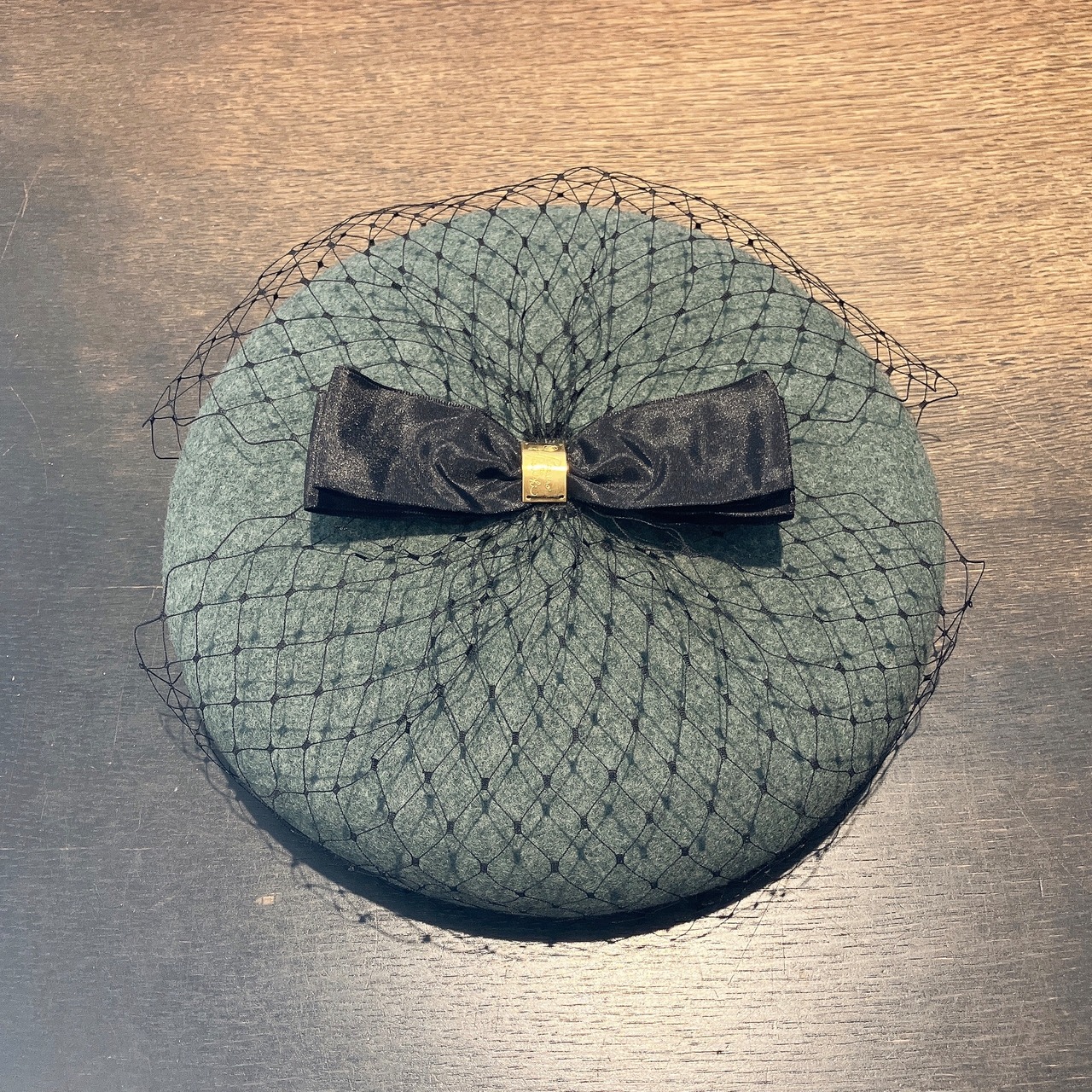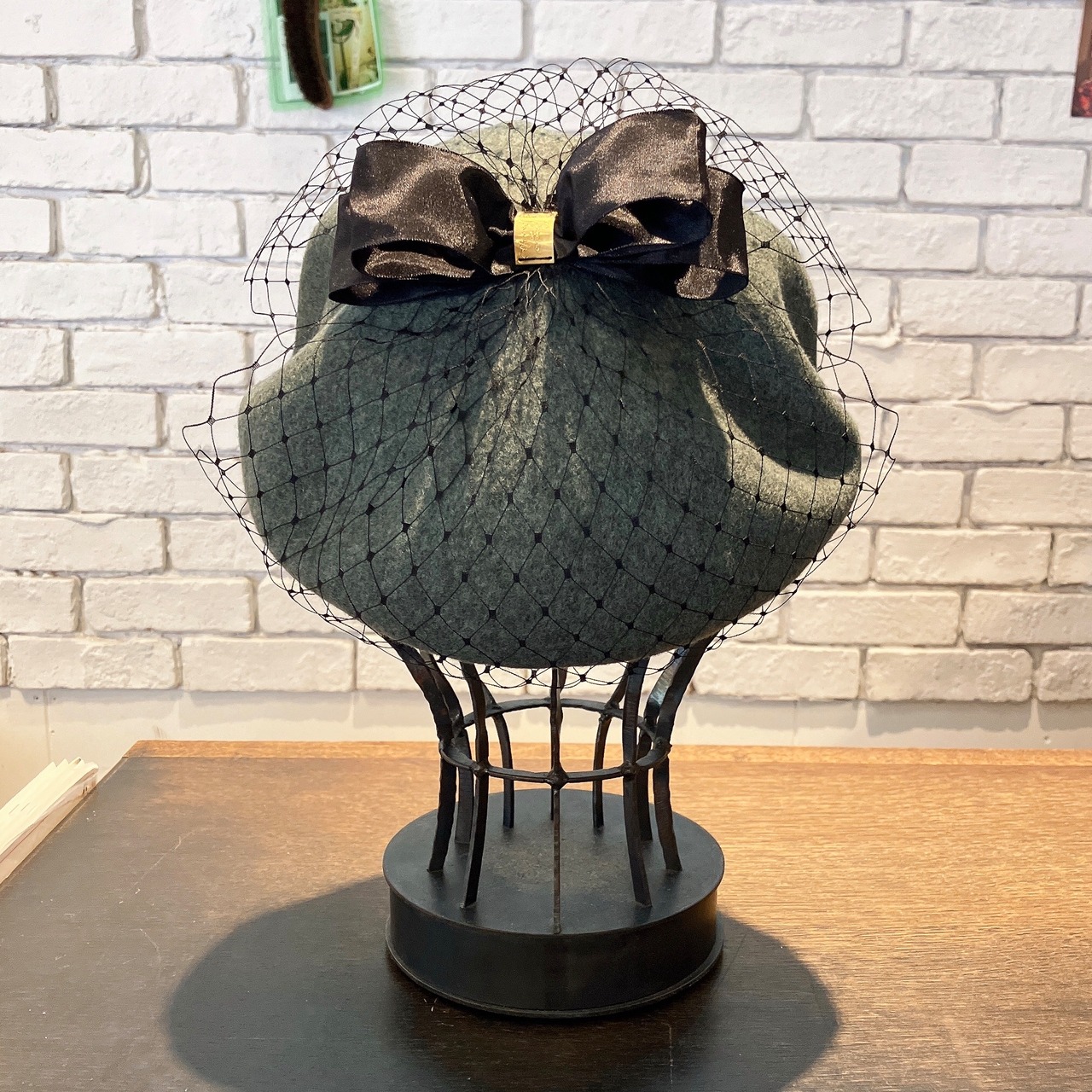 普段使いしやすい小ぶりなベレーにネットチュールを上下にかけ、真ん中でリボンで纏めたようなデザインです。オリジナルのブランドロゴプレートがポイント。