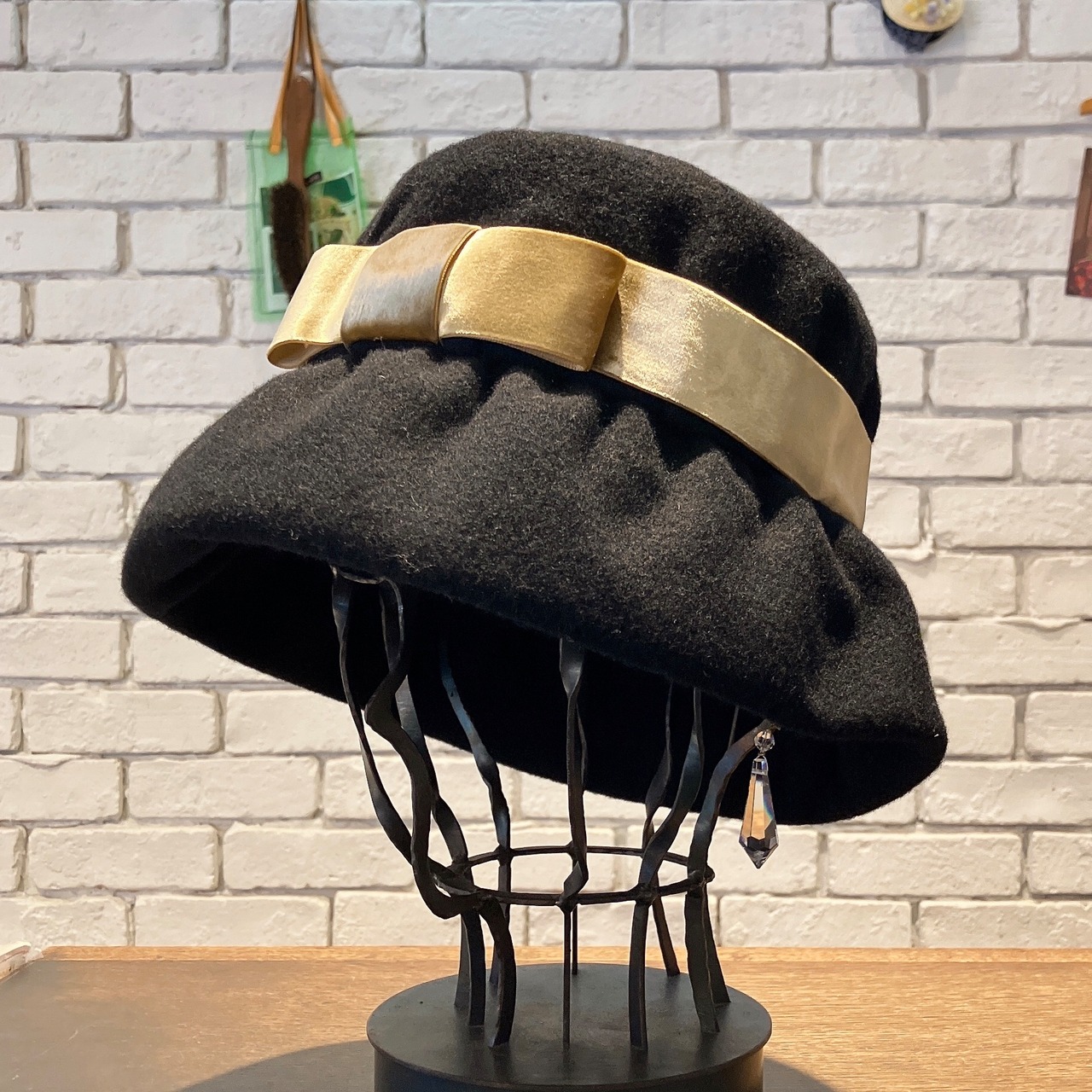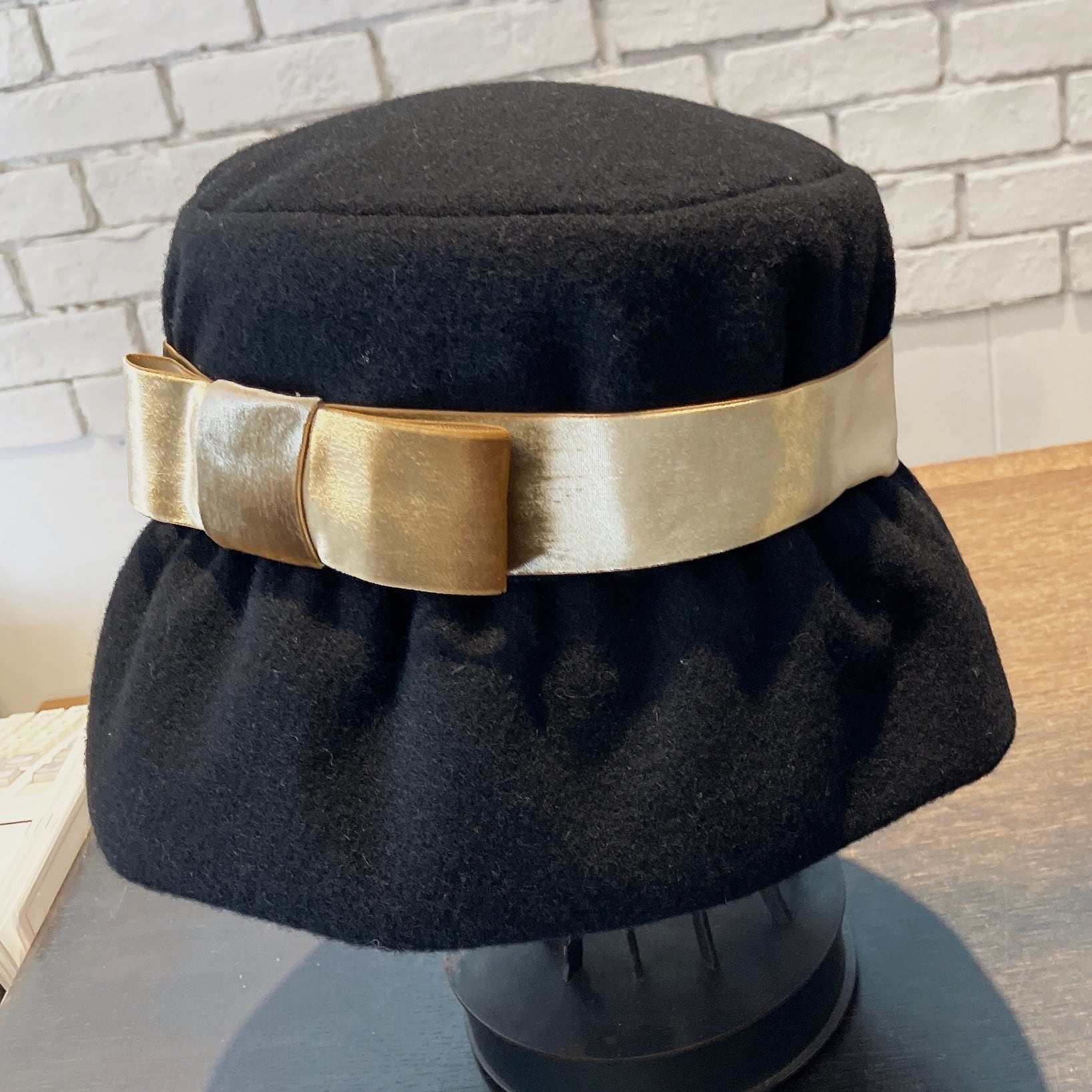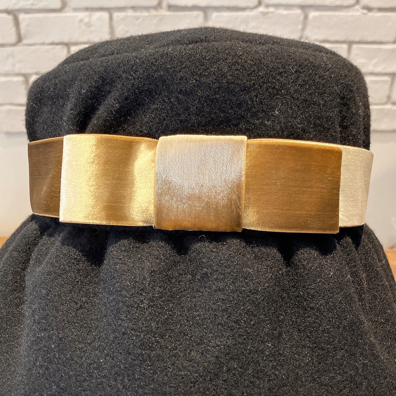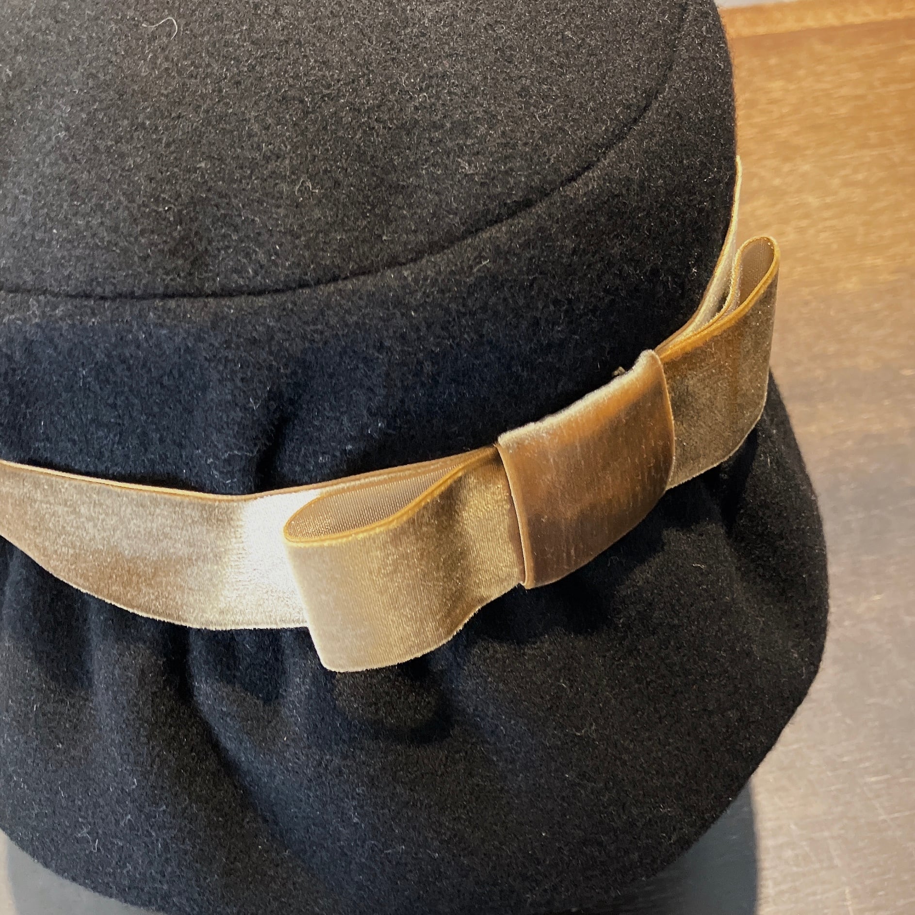 カサブランカのようなお椀型に仕立て、美しい艶感の別珍リボンを巻いてあります。クラウンからブリムにかけて絞ったようなシワがふんわりと立体感を作り出し、上品な印象に。