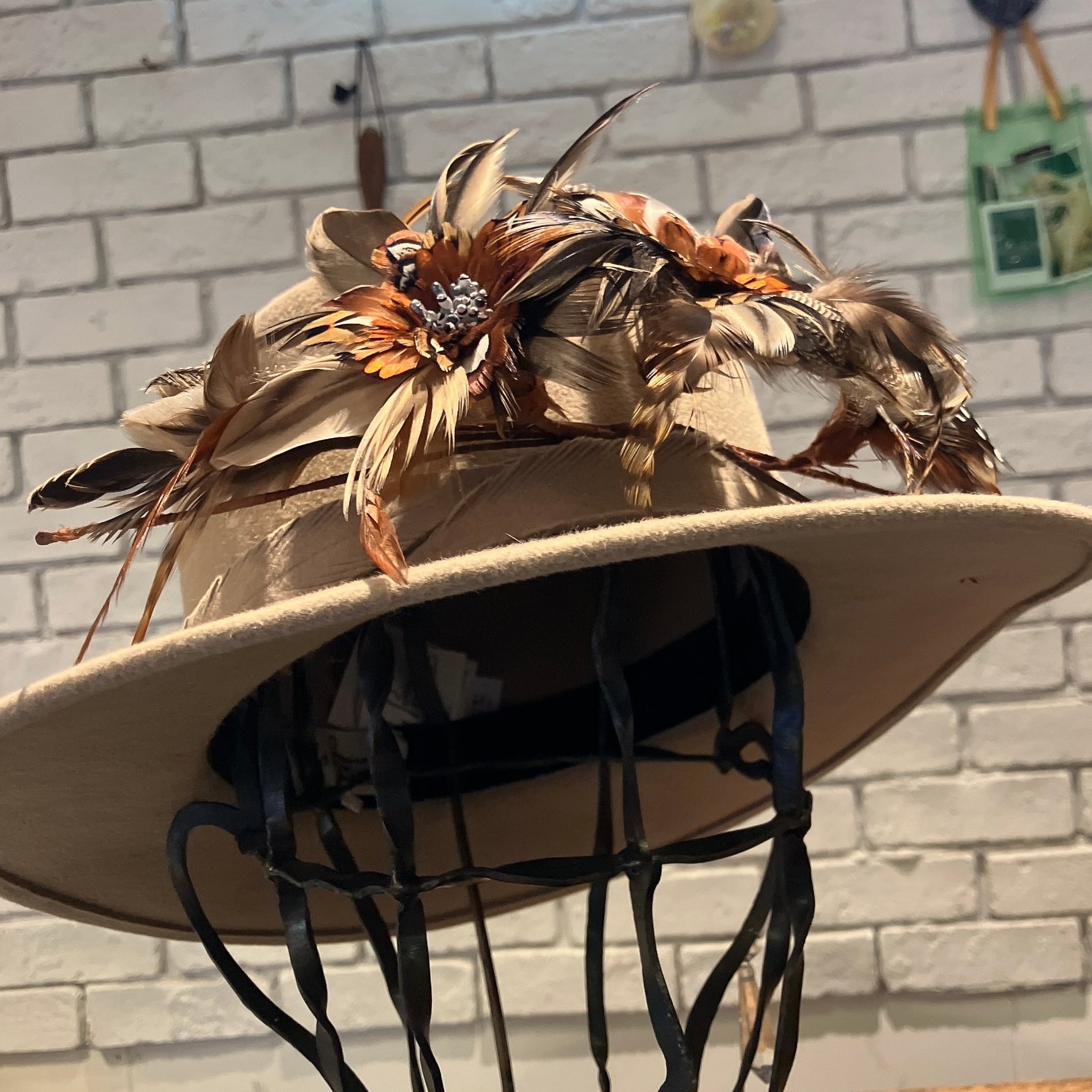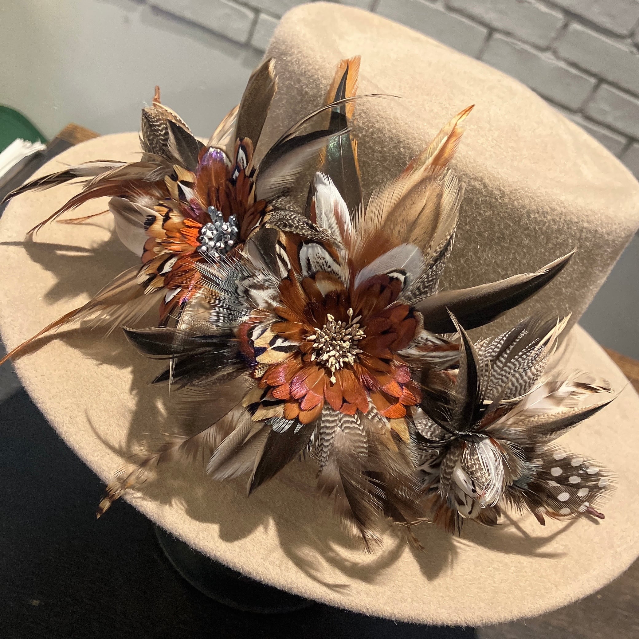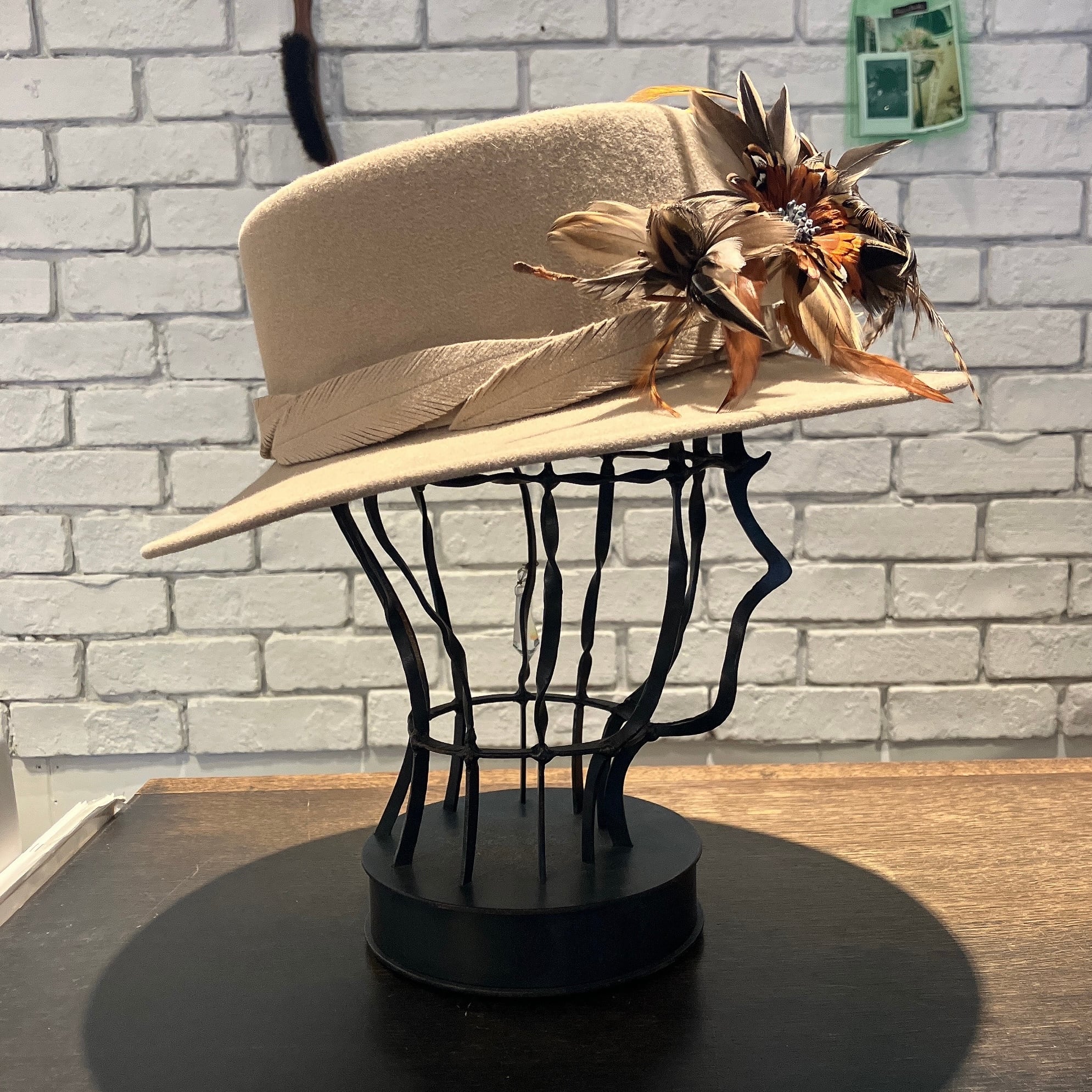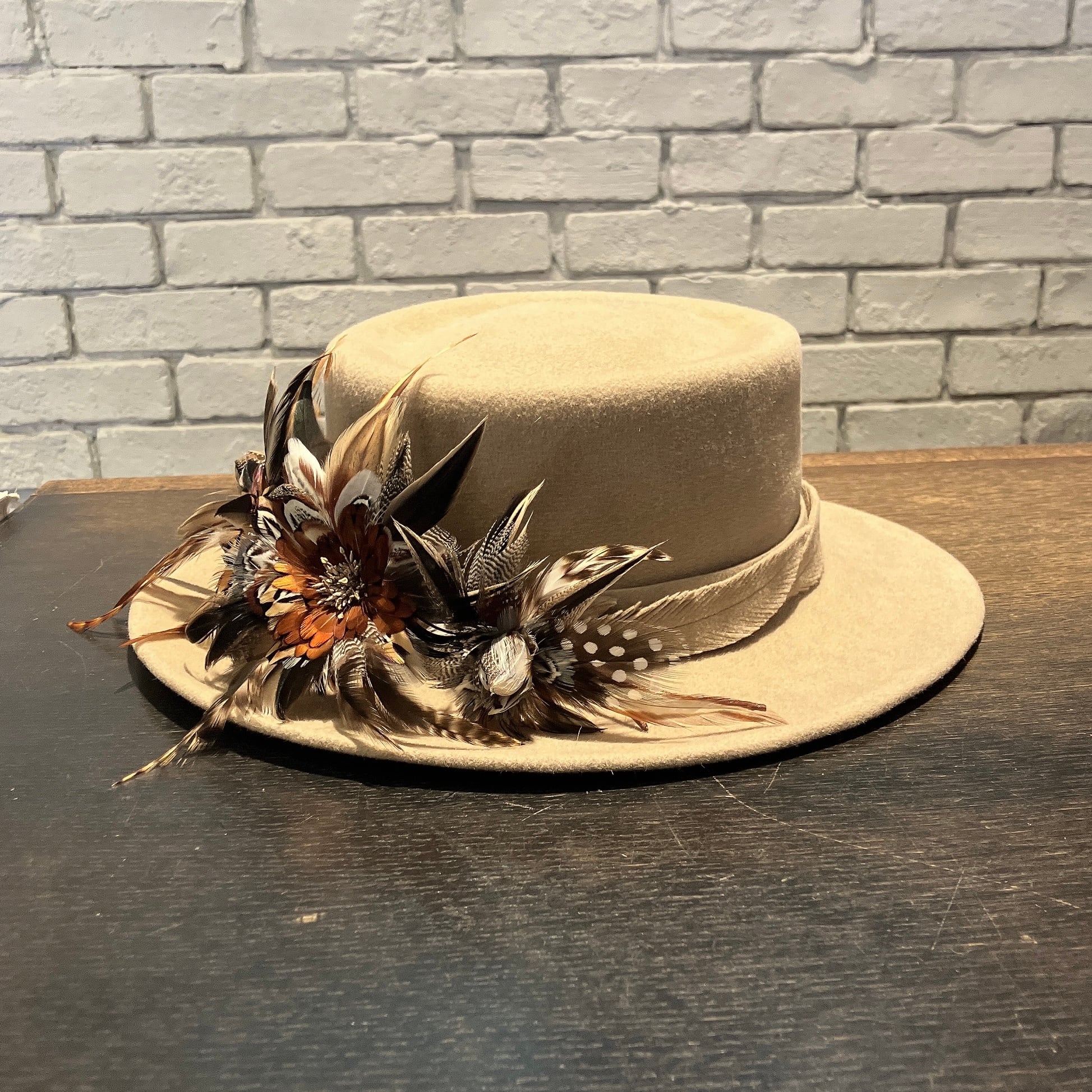 ハット本体にはブラジル製ラビットベロアをふんだんに使用。巻きには共布ラビットベロアで作られた羽根を何枚も巻き付け、細部まで拘り抜かれています。