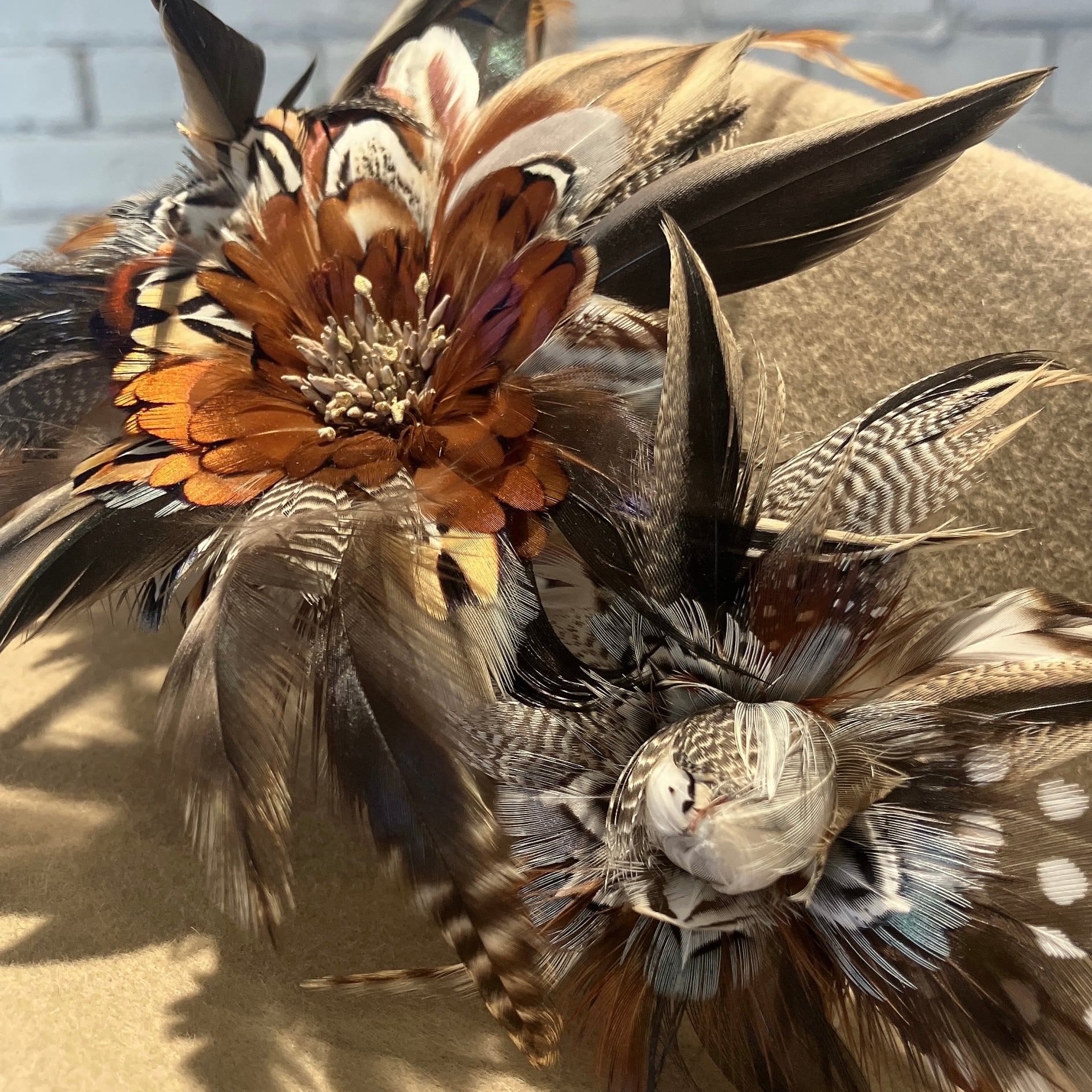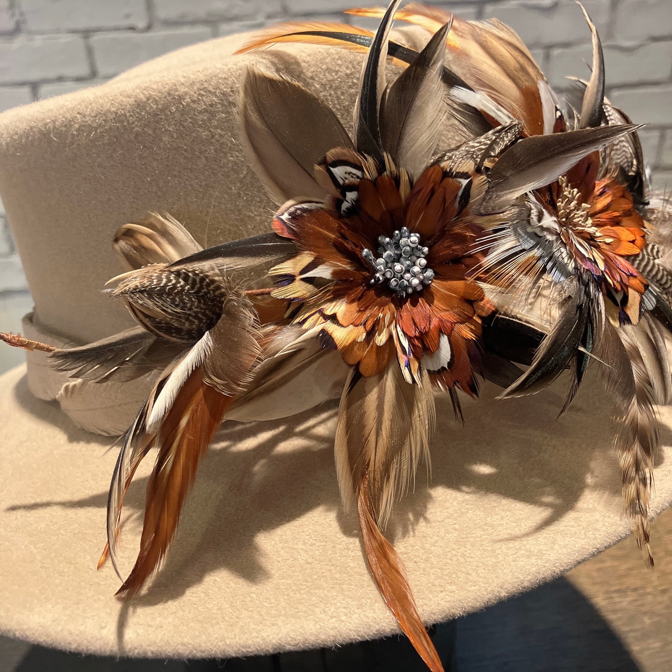 フロントに大胆に飾られた花飾りが一番の特徴。熟練の職人の手で、鳥の羽根を一枚いちまい丁寧に集めあわせて大輪の花を作り出し、両端には今にも綻びそうな蕾も。被れば見えない萼や茎までしっかり作り込まれています。
