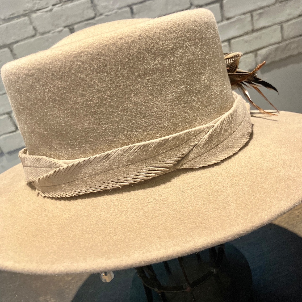 ハット本体には柔らかく型入れされたブラジル製ラビットベロアをふんだんに使用。巻きには共布ラビットベロアで制作された羽根を何枚も巻き付け、細部まで拘り抜かれています。