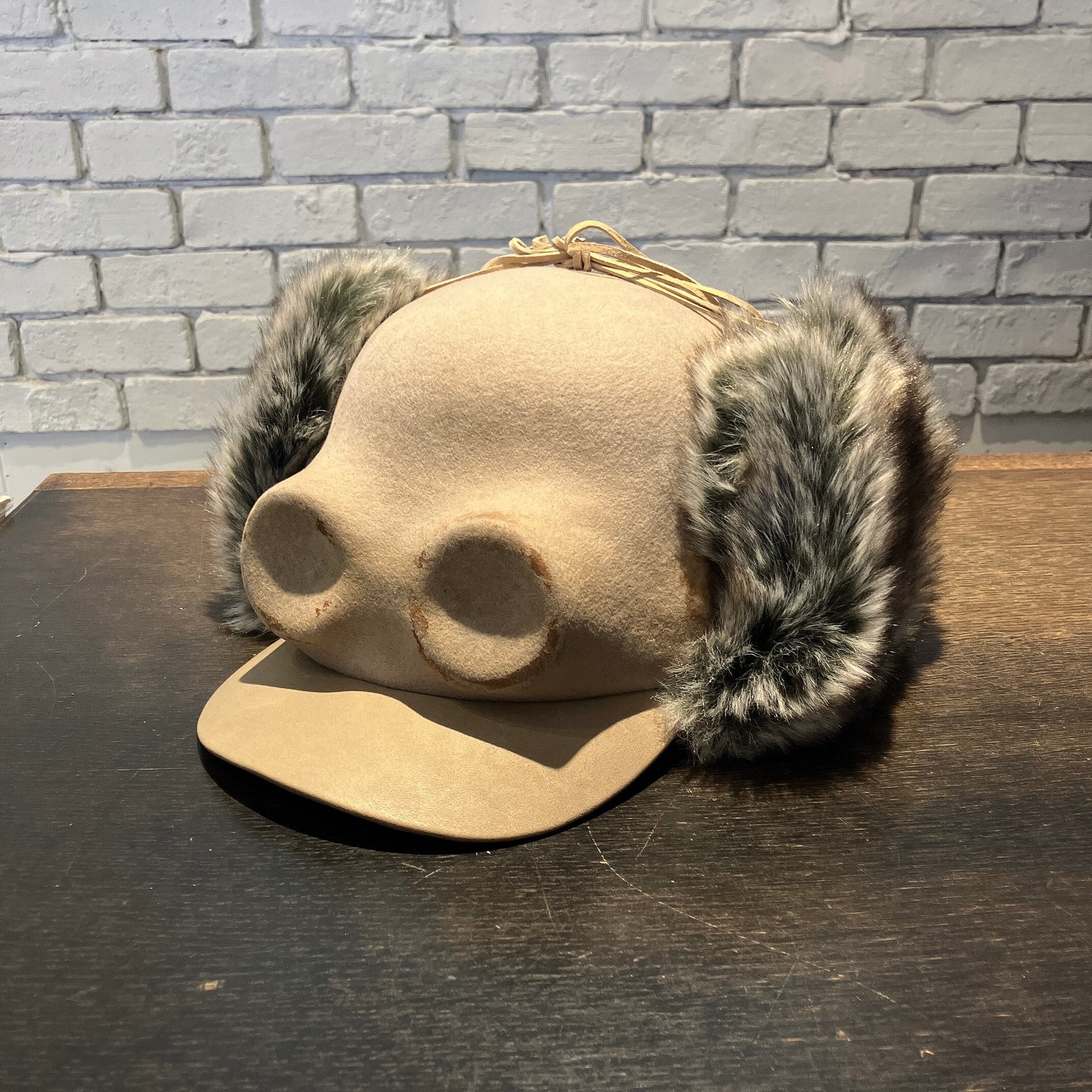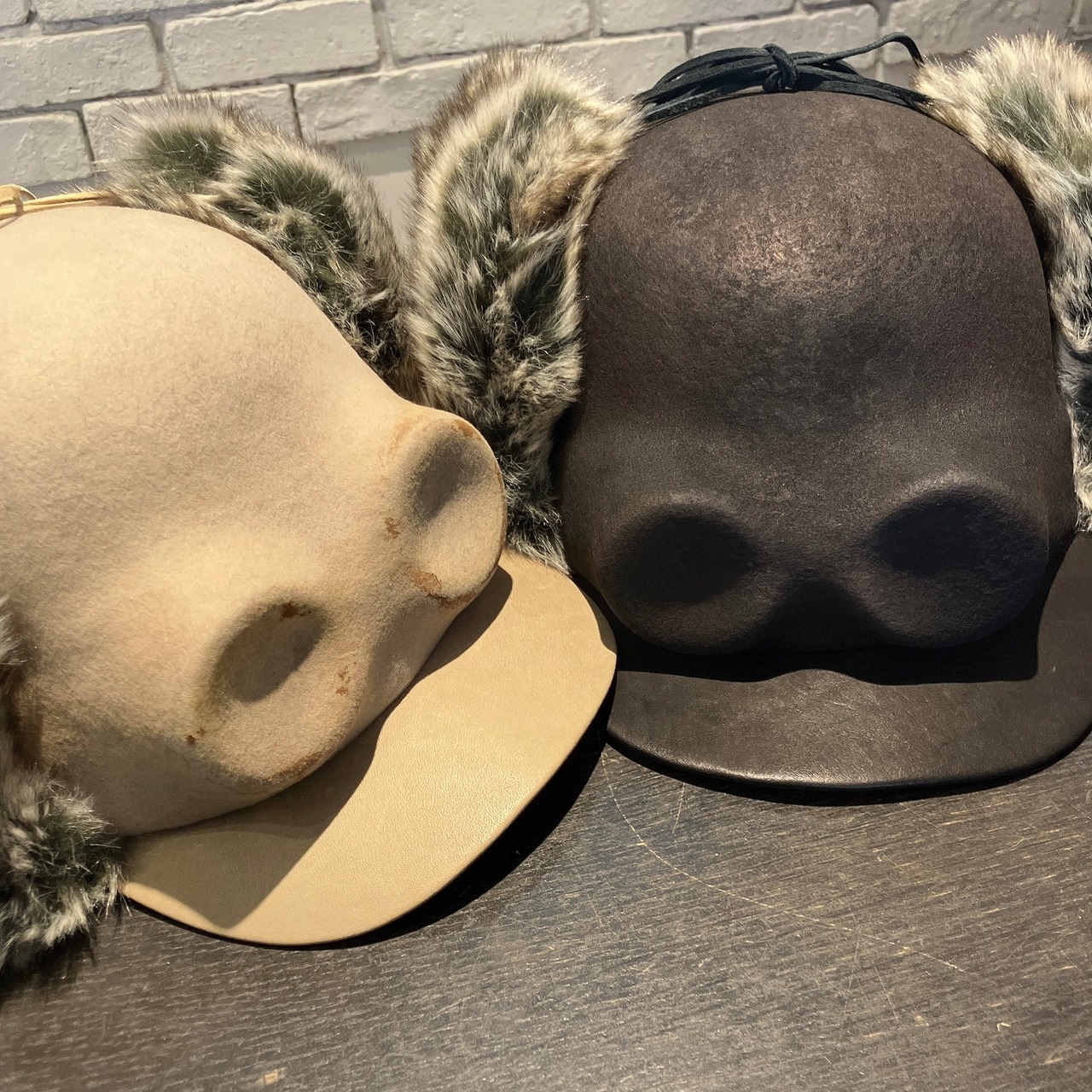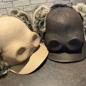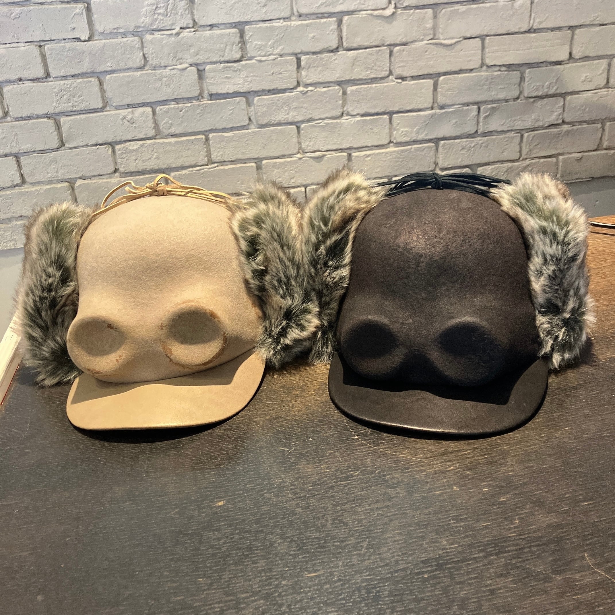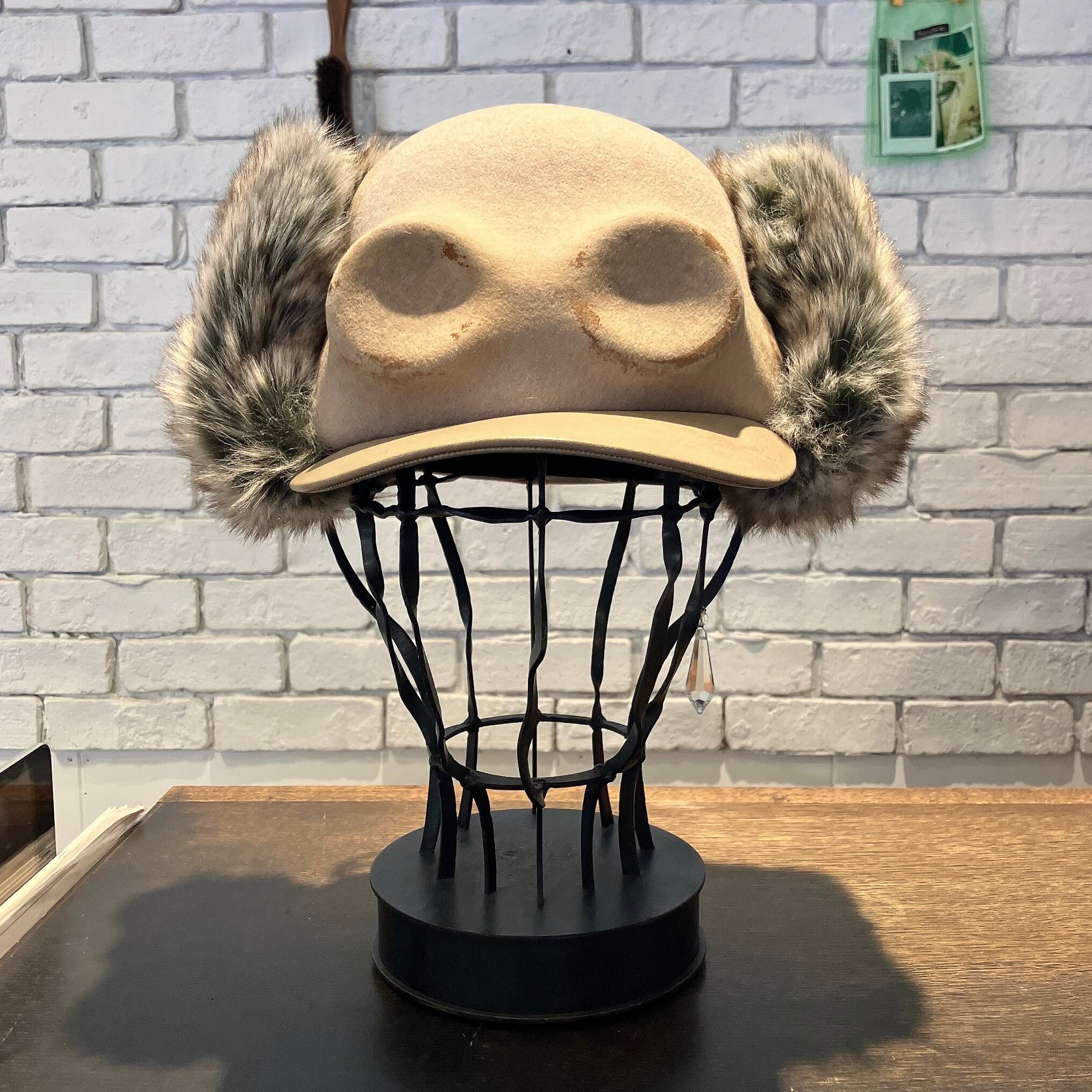 深い被りのフェルトキャップ本体に更にゴーグルが埋め込まれたような形に型入れし、バーン加工で焼き焦がした質感に。WHITEカラーはゴーグルの凸部分とクラウンサイド、BLACKカラーはクラウン全体を加工してあります。牛革の短いツバと紐、サイドにはかなりボリュームのあるチンチラ風フェイクファーのイヤーフラップを。