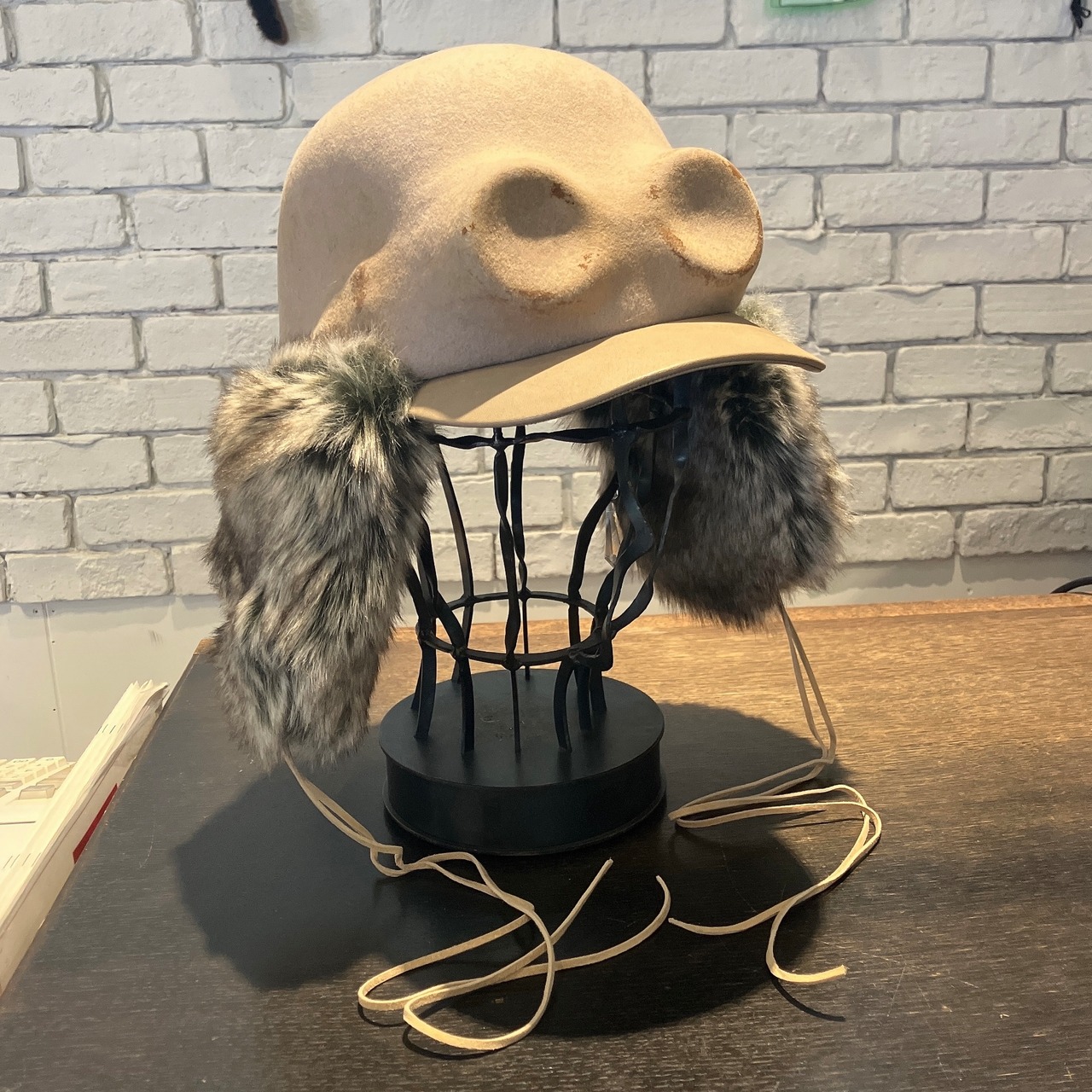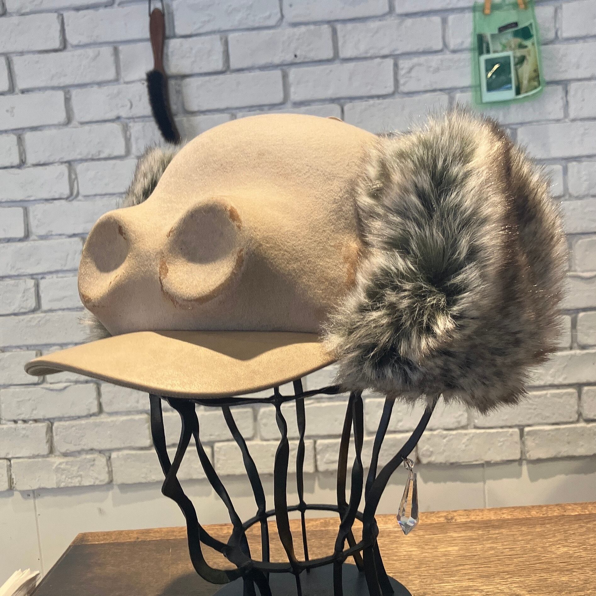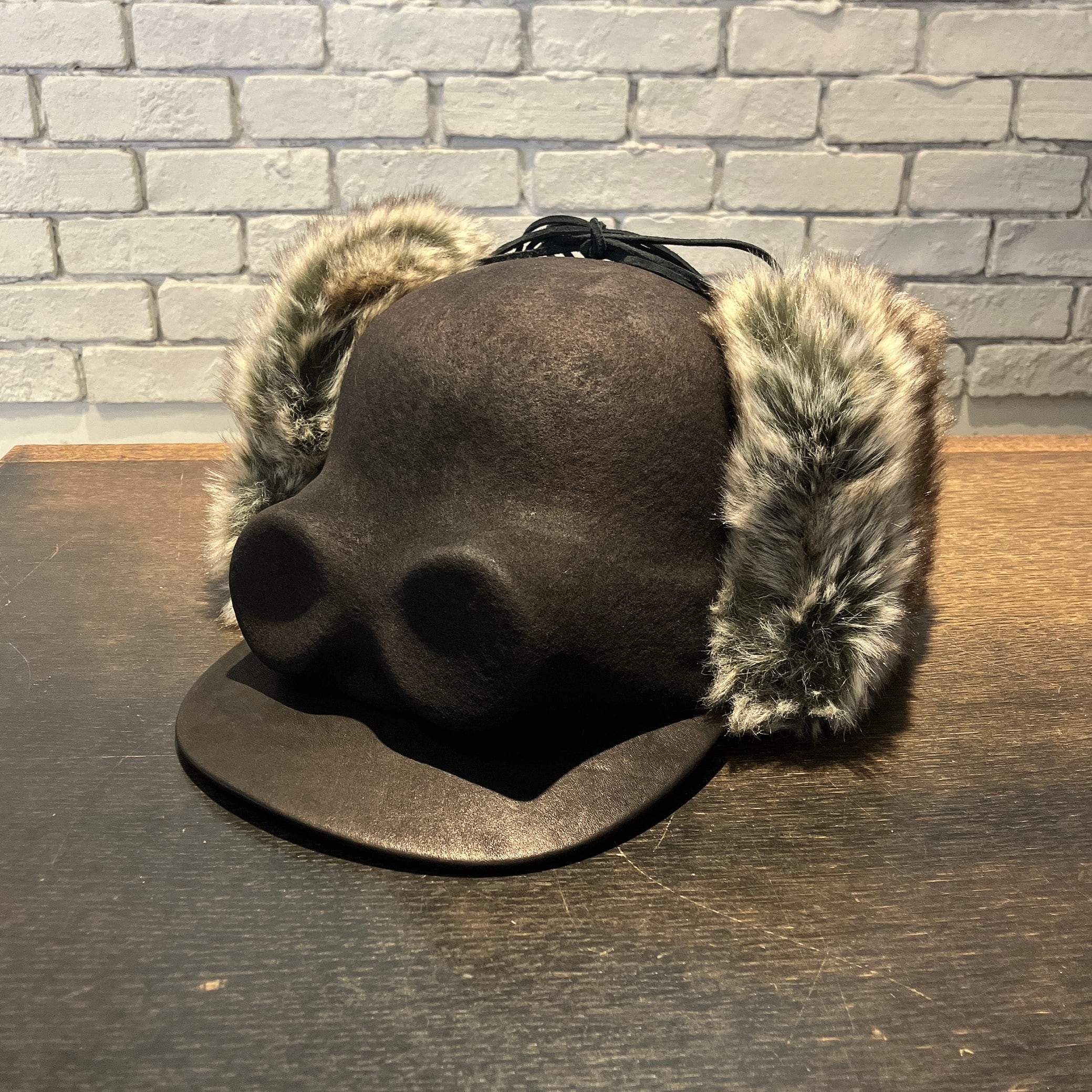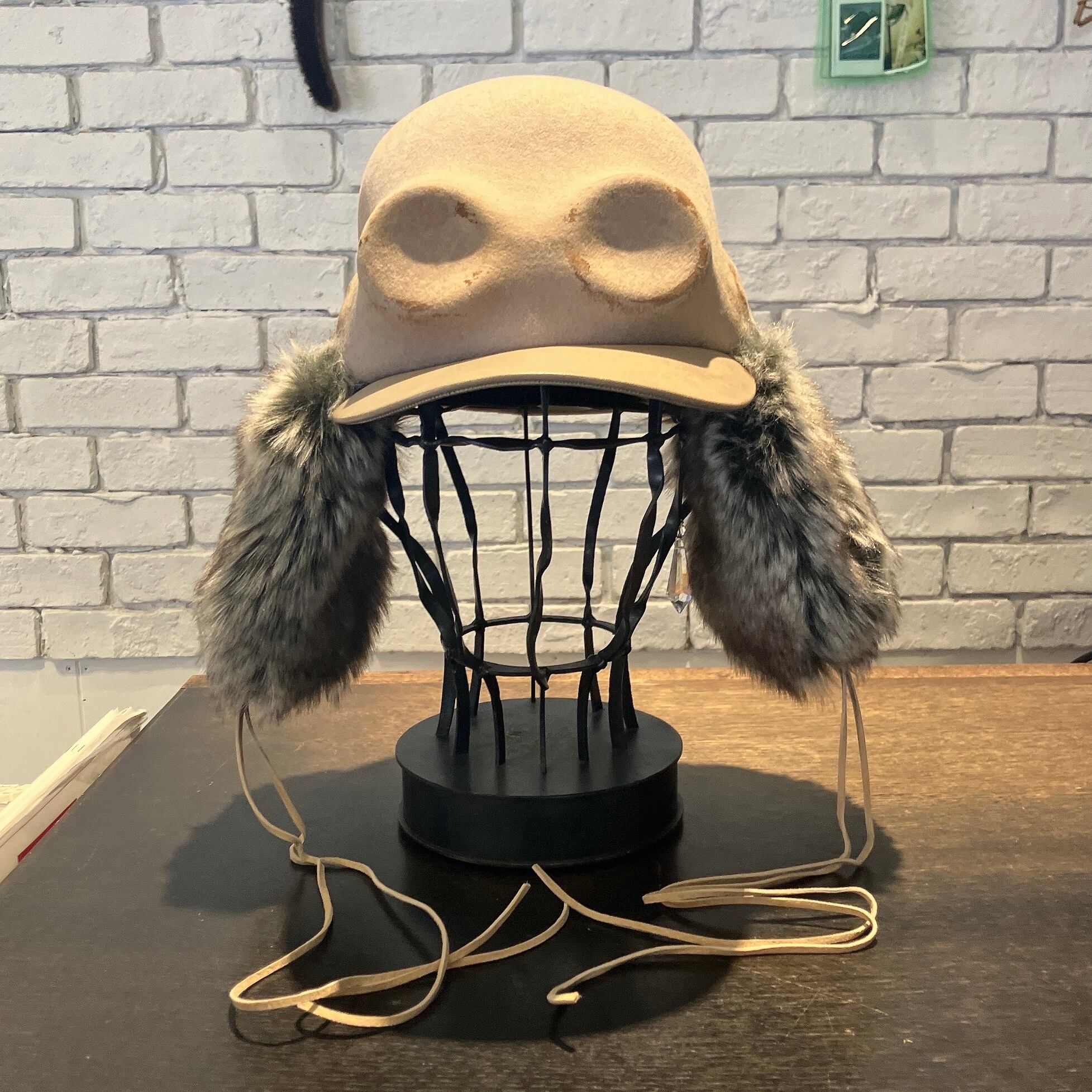 深い被りのフェルトキャップ本体に更にゴーグルが埋め込まれたような形に型入れし、バーン加工で焼き焦がした質感に。WHITEカラーはゴーグルの凸部分とクラウンサイド、BLACKカラーはクラウン全体を加工してあります。牛革の短いツバと紐、サイドにはかなりボリュームのあるチンチラ風フェイクファーのイヤーフラップを。