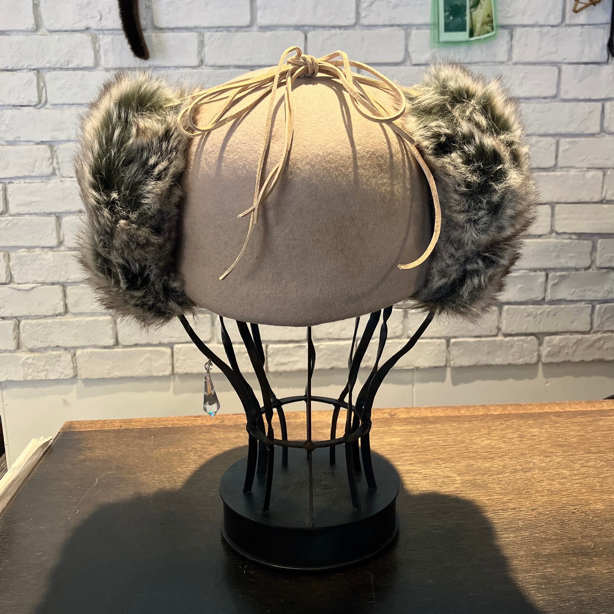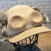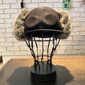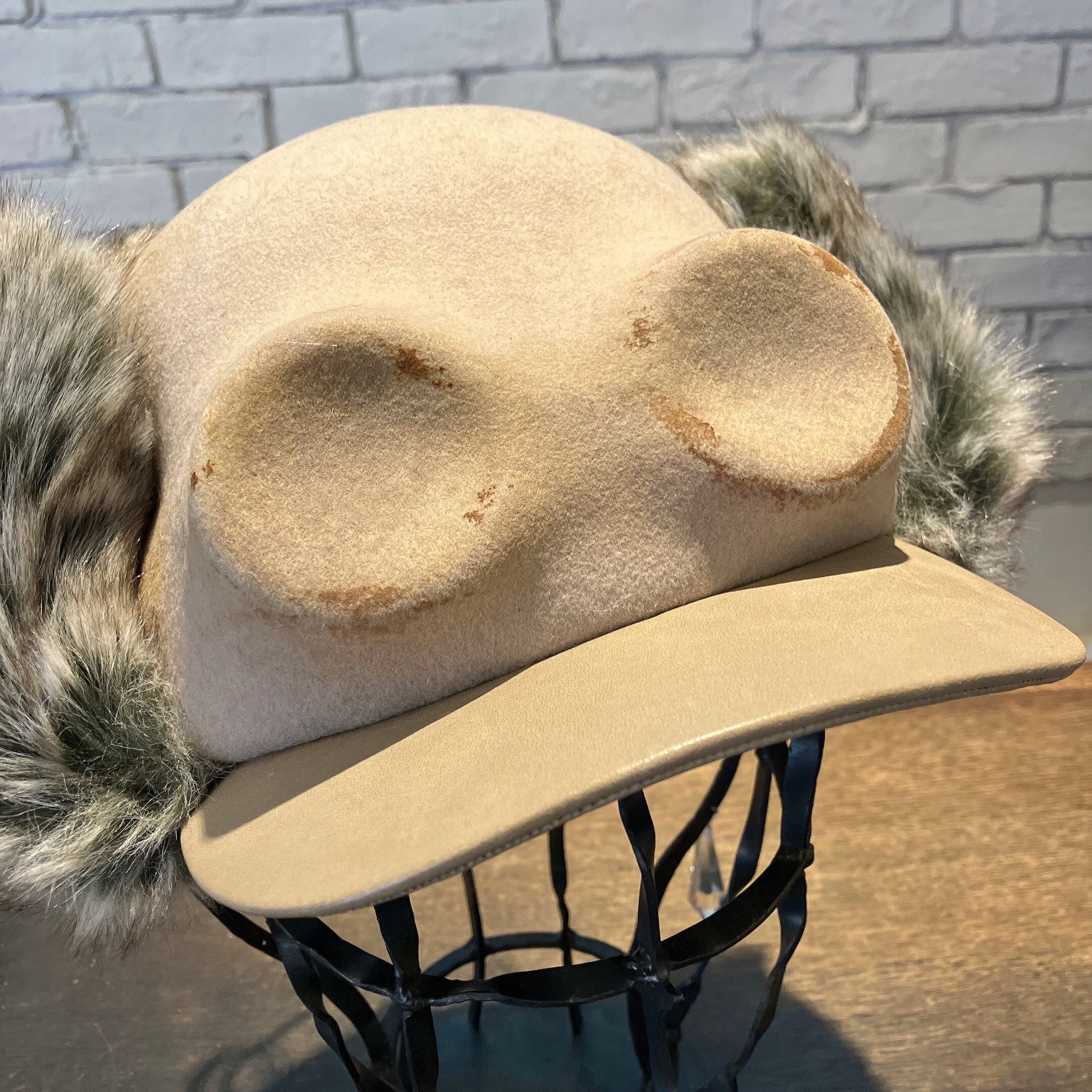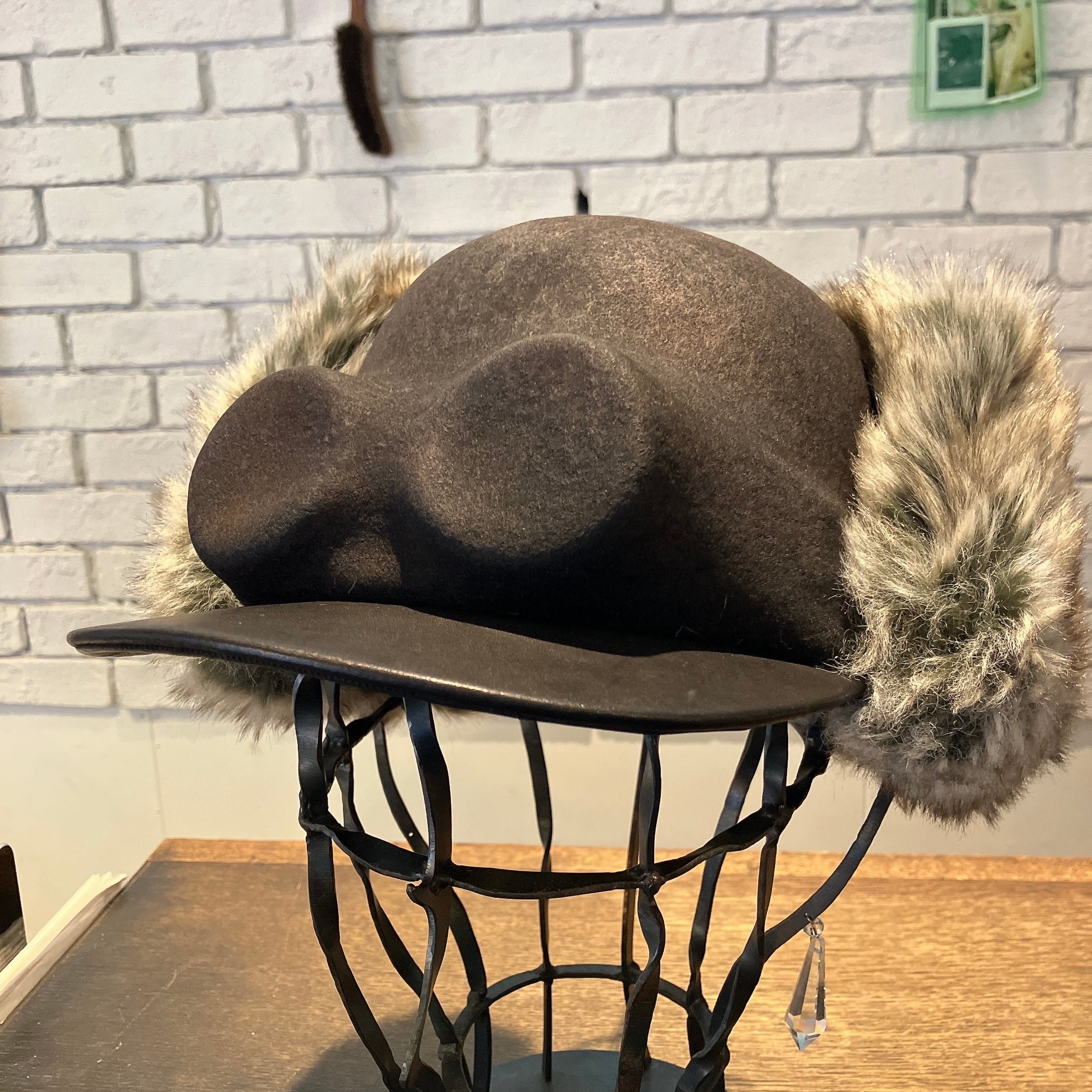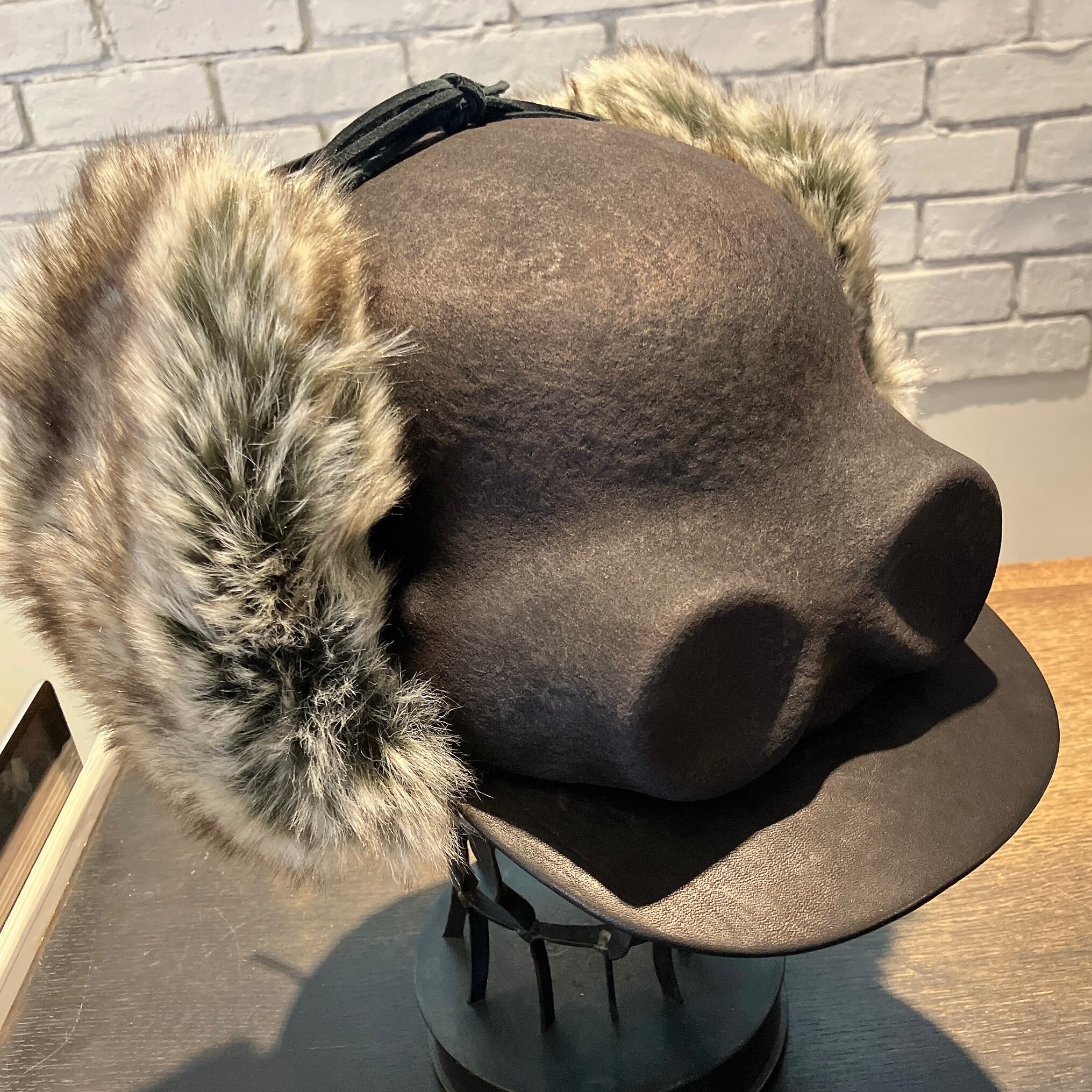 深い被りのフェルトキャップ本体に更にゴーグルが埋め込まれたような形に型入れし、バーン加工で焼き焦がした質感に。WHITEカラーはゴーグルの凸部分とクラウンサイド、BLACKカラーはクラウン全体を加工してあります。牛革の短いツバと紐、サイドにはかなりボリュームのあるチンチラ風フェイクファーのイヤーフラップを。
