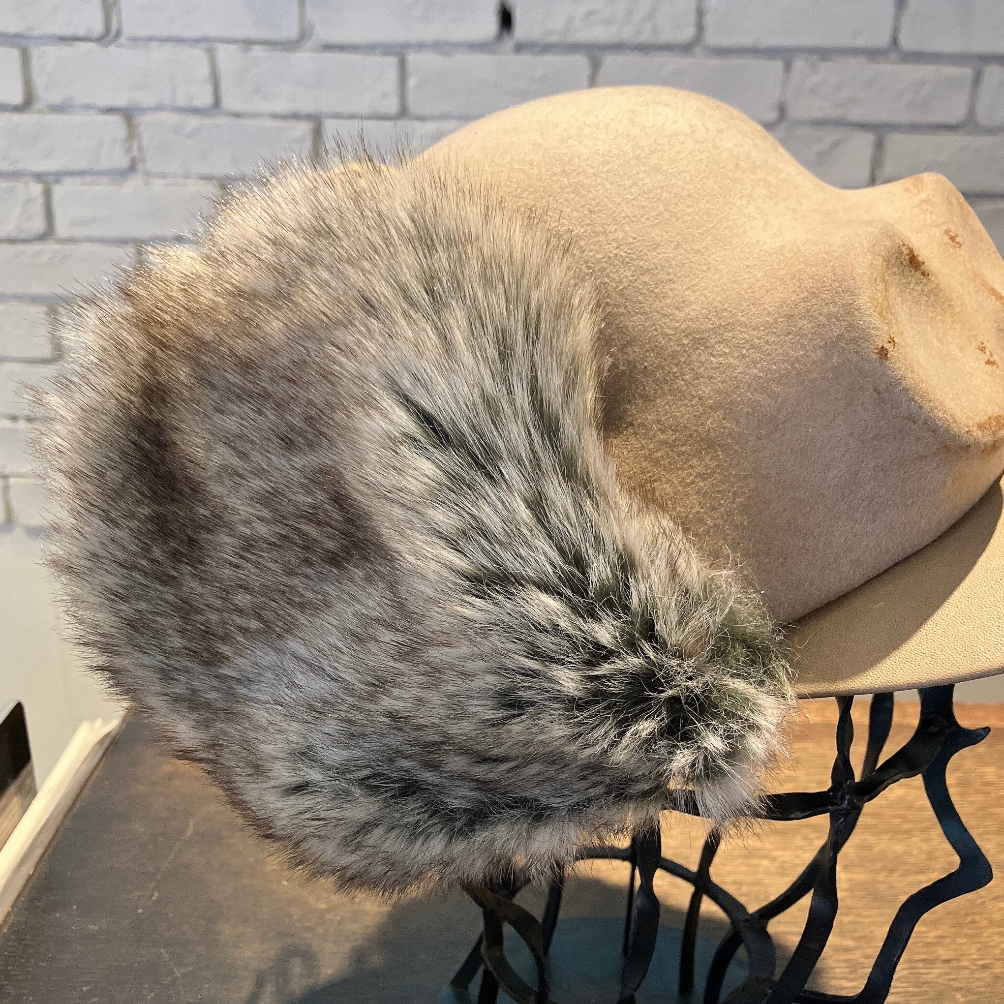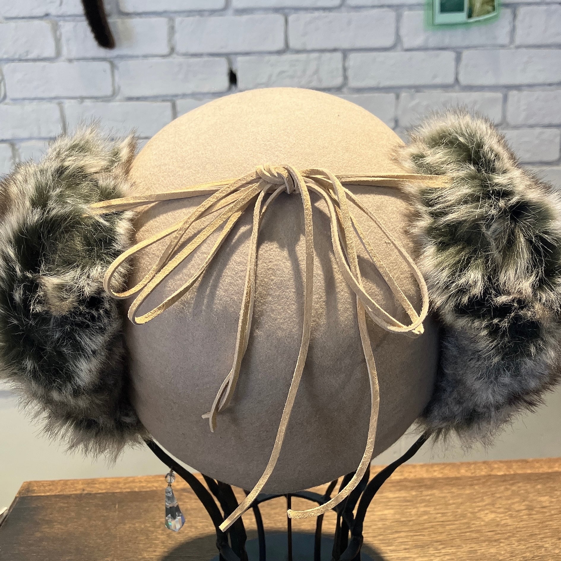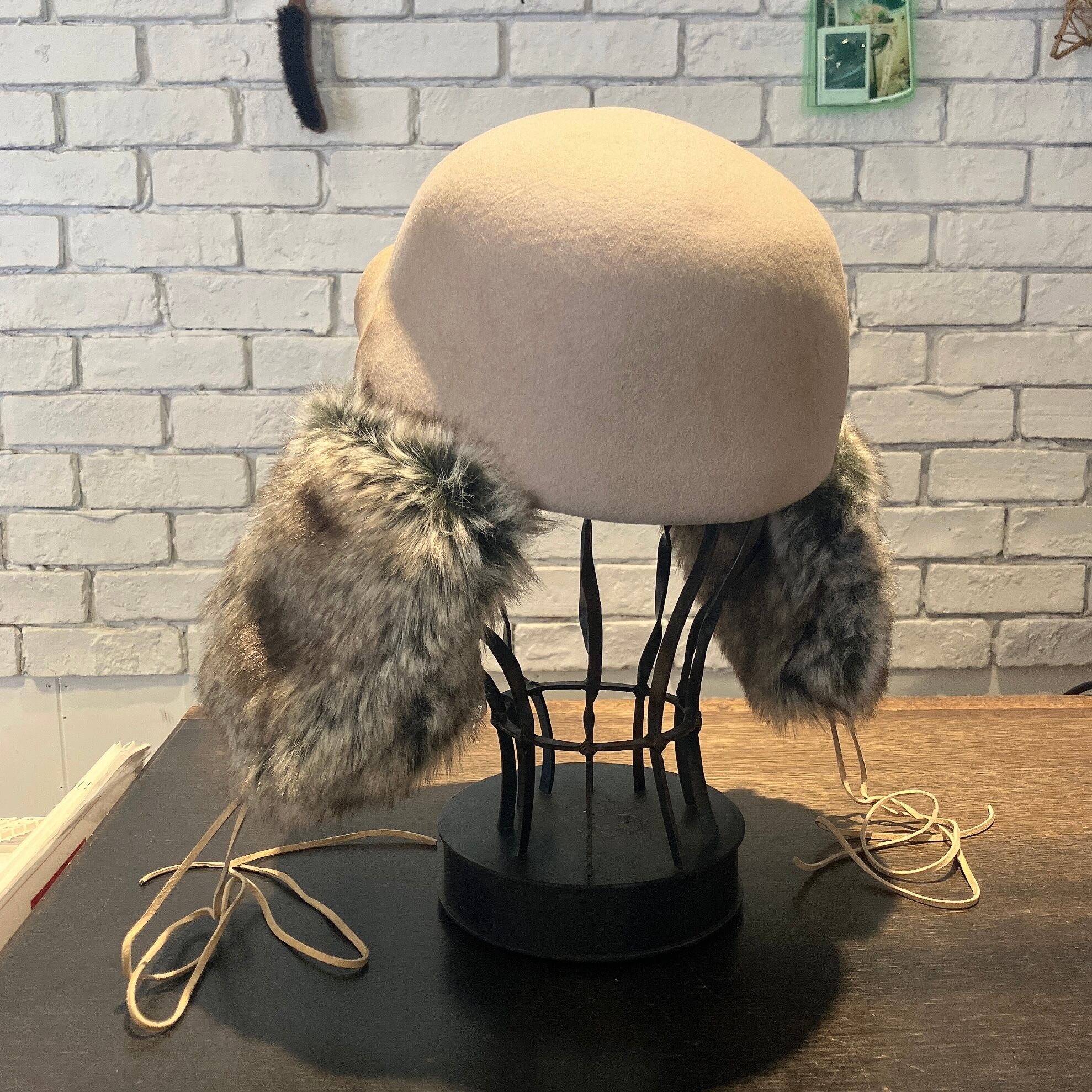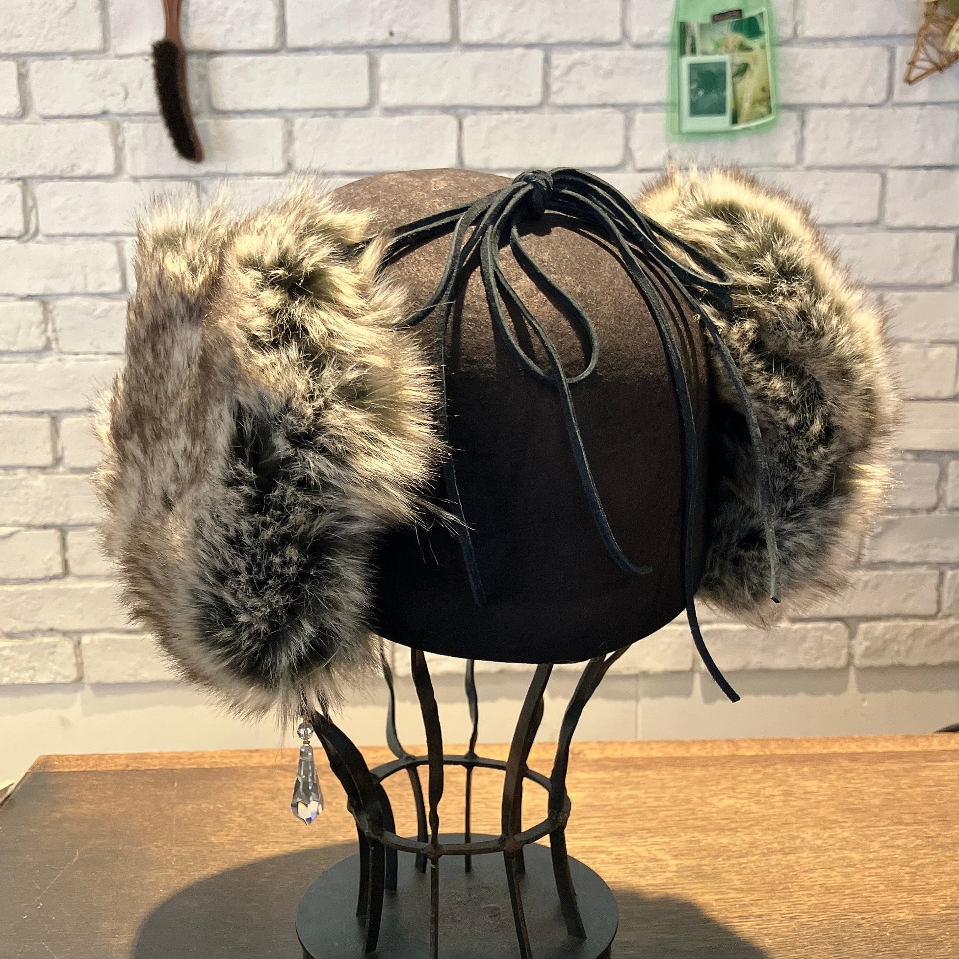 深い被りのフェルトキャップ本体に更にゴーグルが埋め込まれたような形に型入れし、バーン加工で焼き焦がした質感に。WHITEカラーはゴーグルの凸部分とクラウンサイド、BLACKカラーはクラウン全体を加工してあります。牛革の短いツバと紐、サイドにはかなりボリュームのあるチンチラ風フェイクファーのイヤーフラップを。