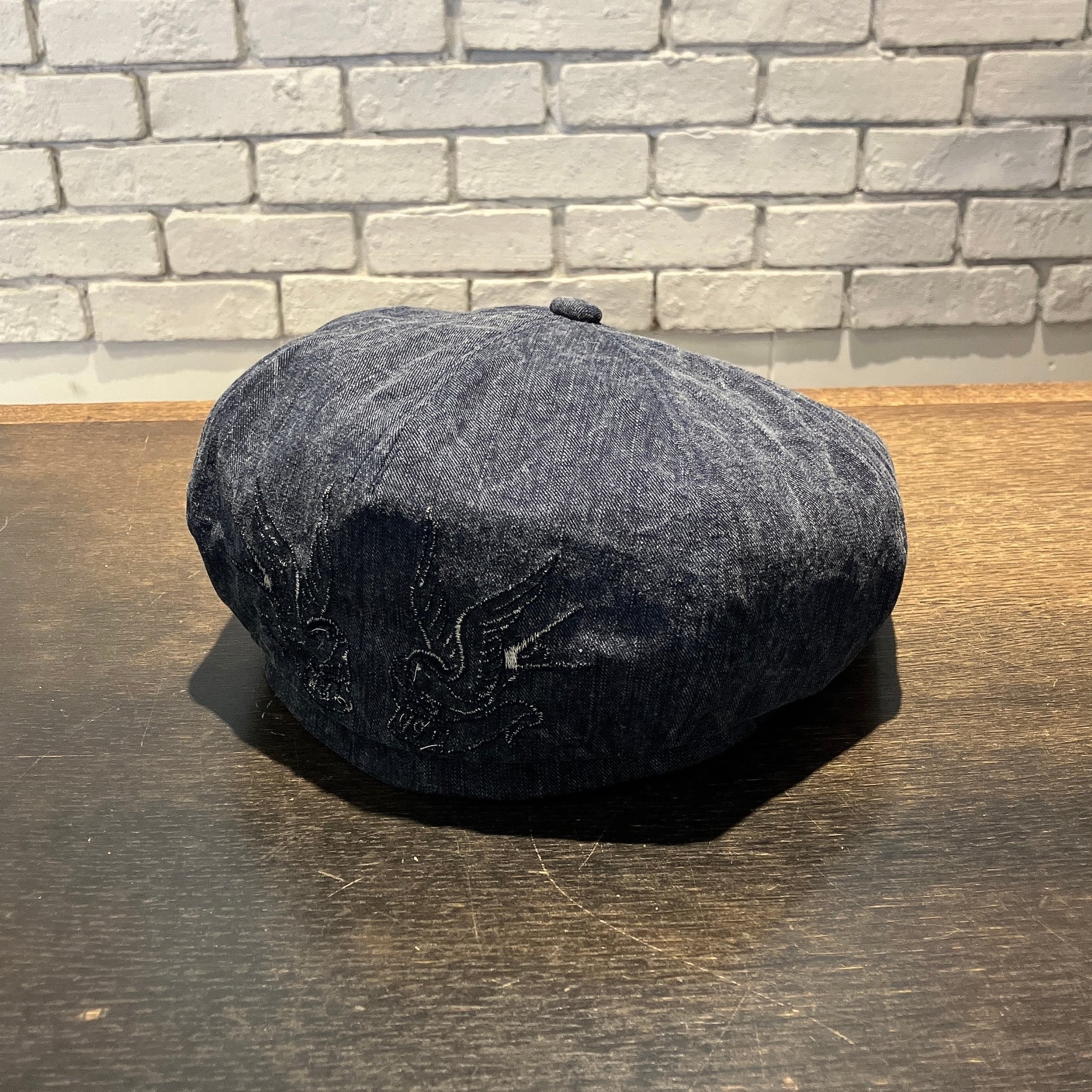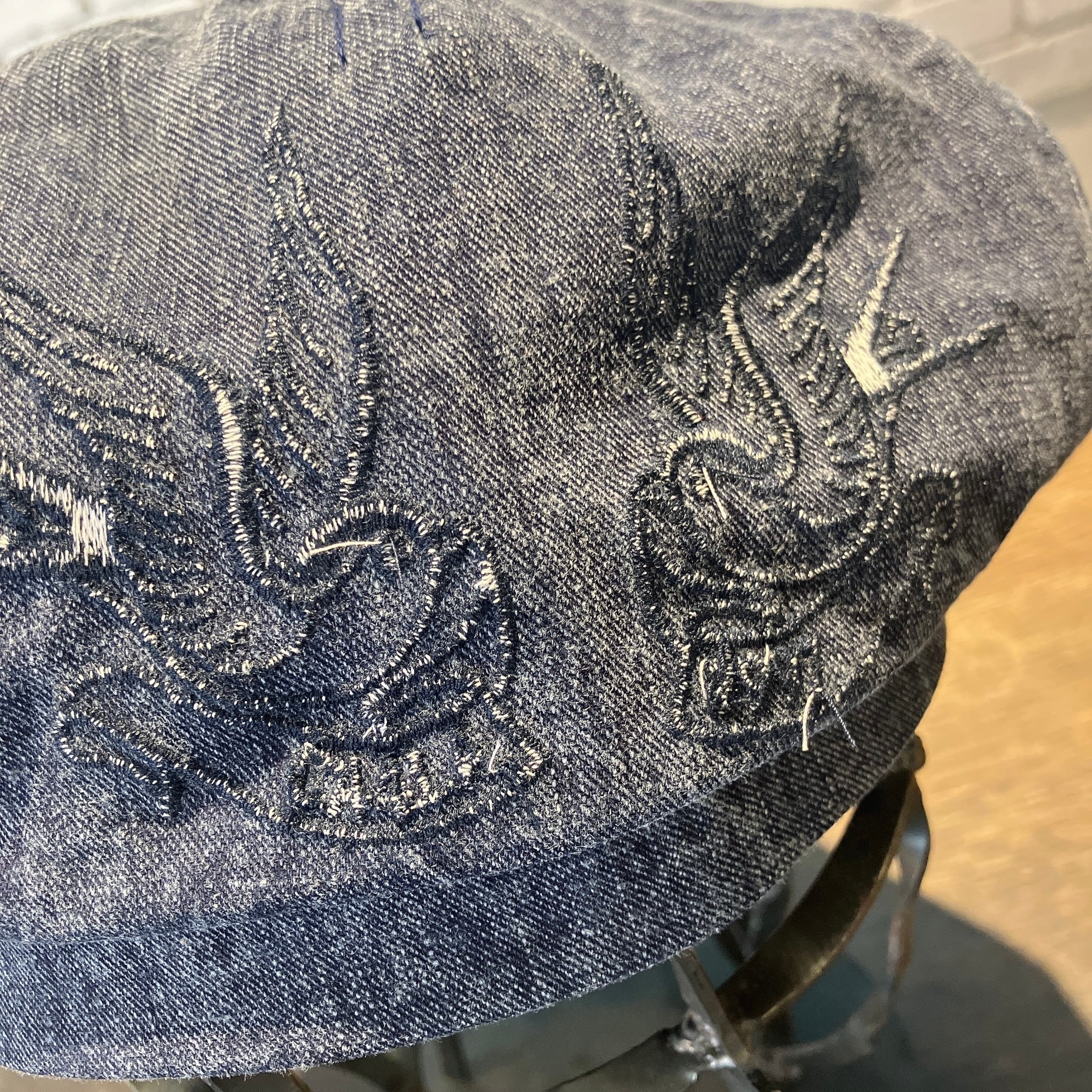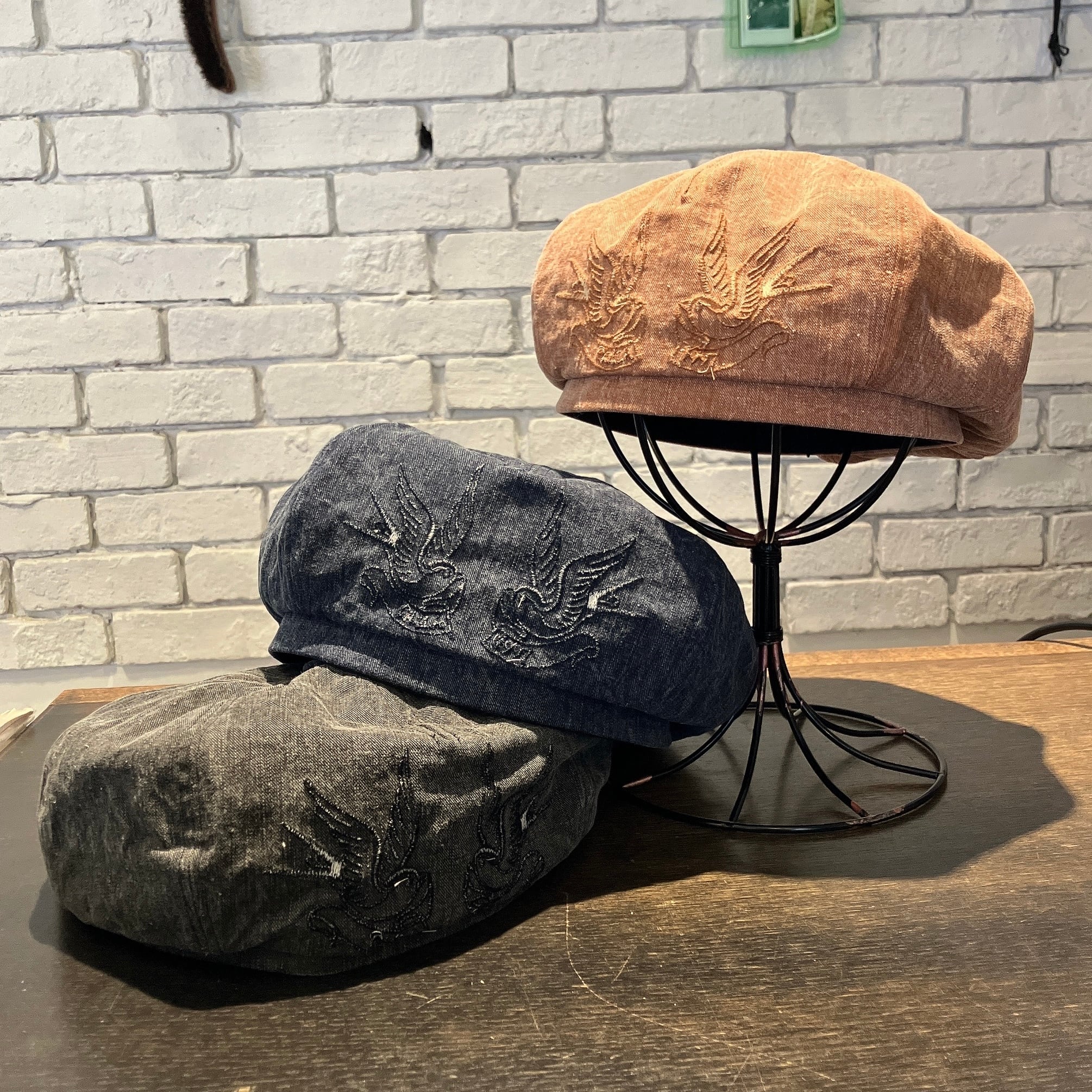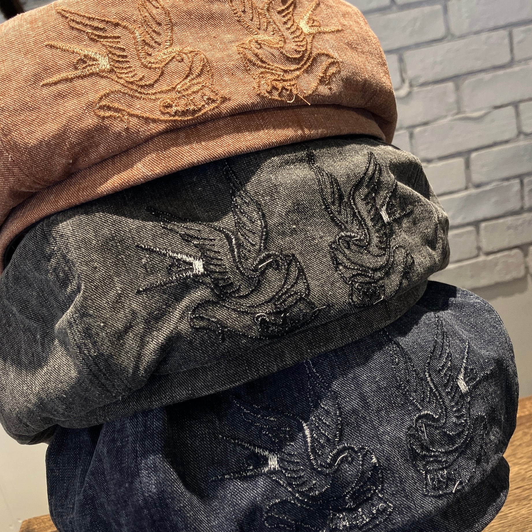 つばめをモチーフにした刺繍がさり気ないアクセント。かすれたような表情が生地の風合いと相まって、ヴィンテージ調なデザインに仕上がっています。