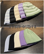 片面は同系色のボーダー模様、片面は無地にブランドネームのワンポイント刺繍。その日の気分で雰囲気を変えてお楽しみいただけます。