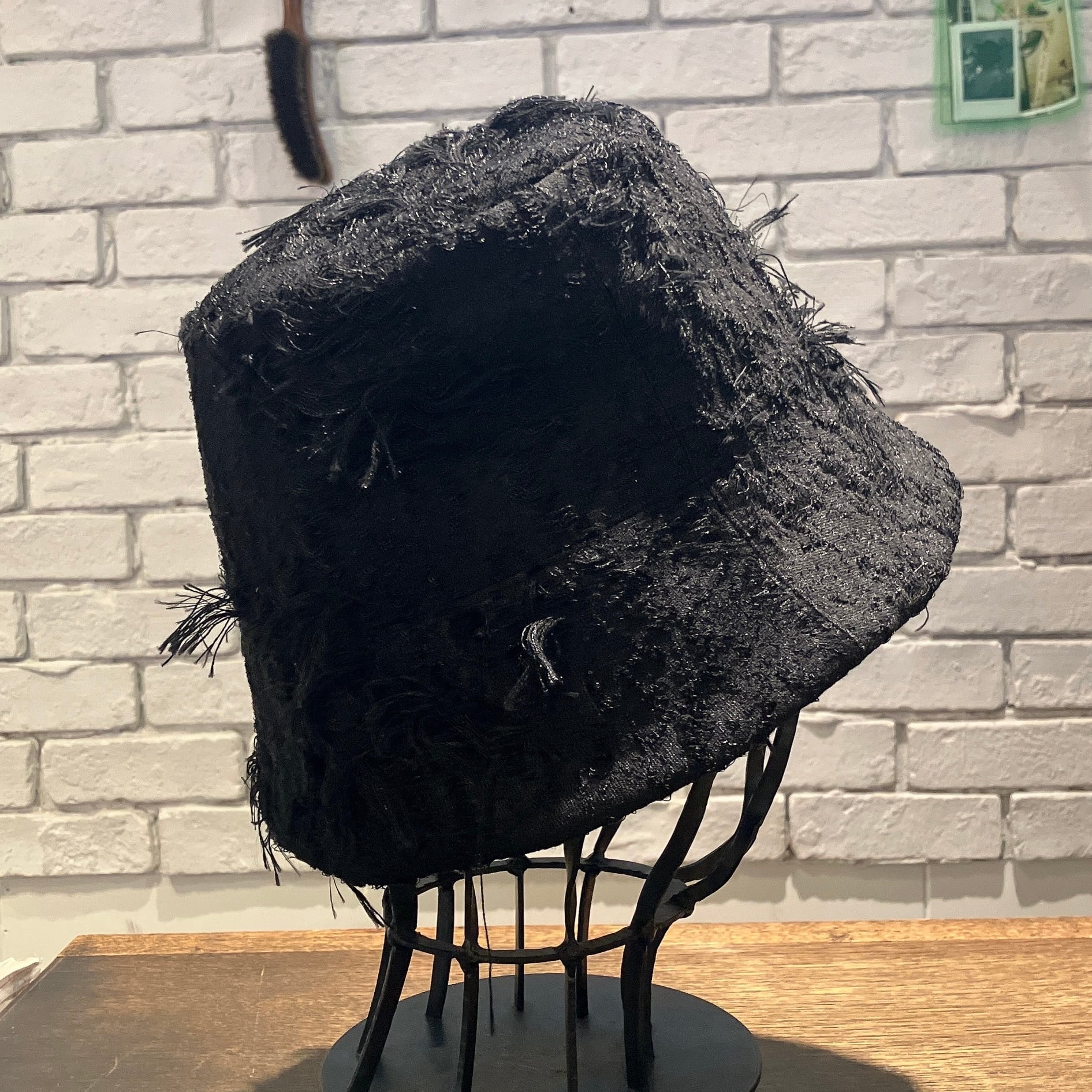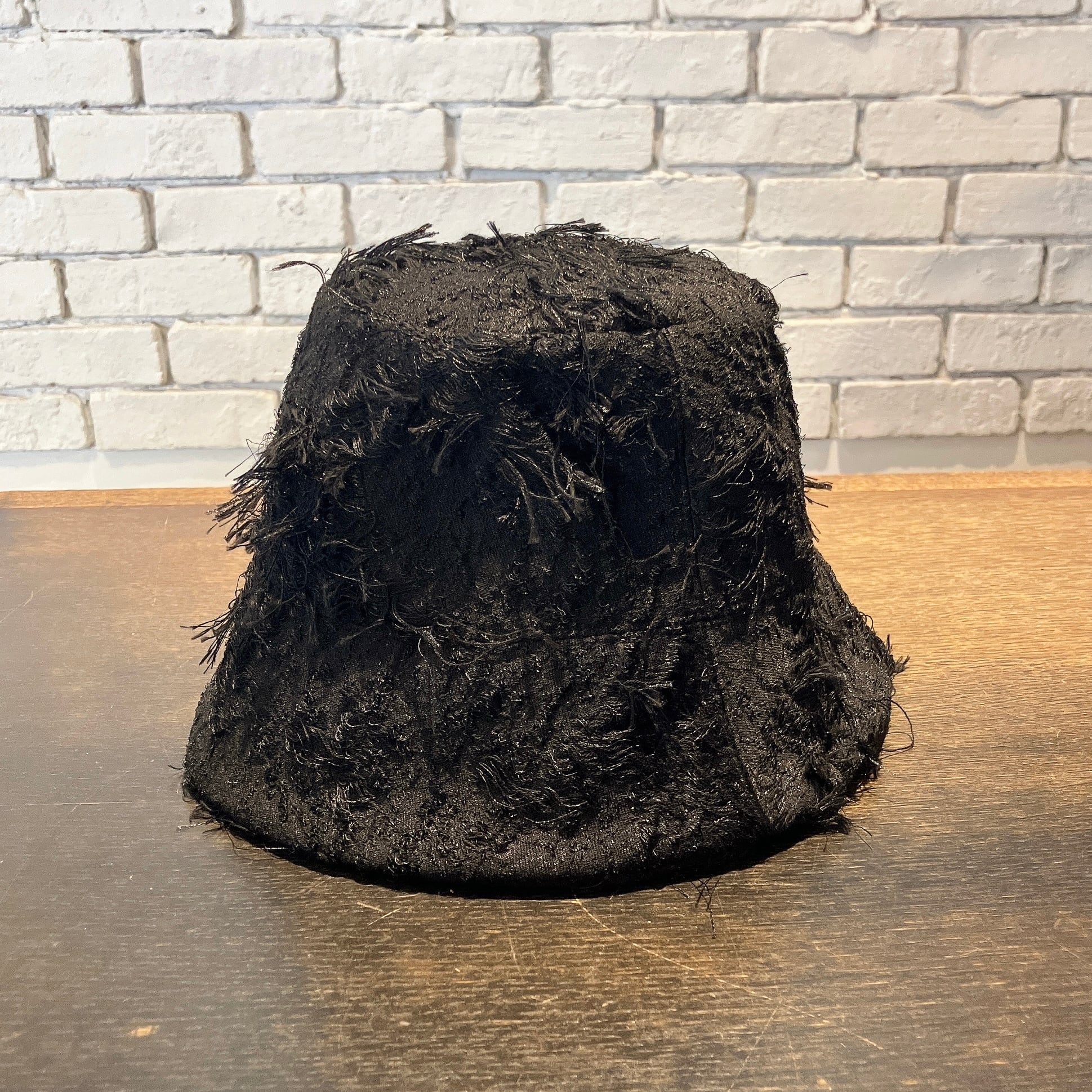 植木鉢のような独特な筒形。天井がスッキリ小さいので被った時に頭も小さく見え、目元まで覆えるほど真下へ向かうツバが少しモードで印象的。ツバ先の厚みすらも計算しつくされたシルエットの美しさはこのブランドならではです。