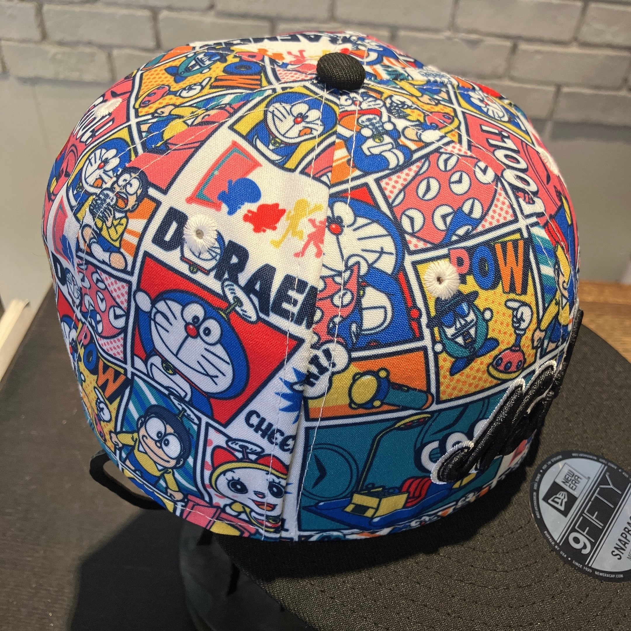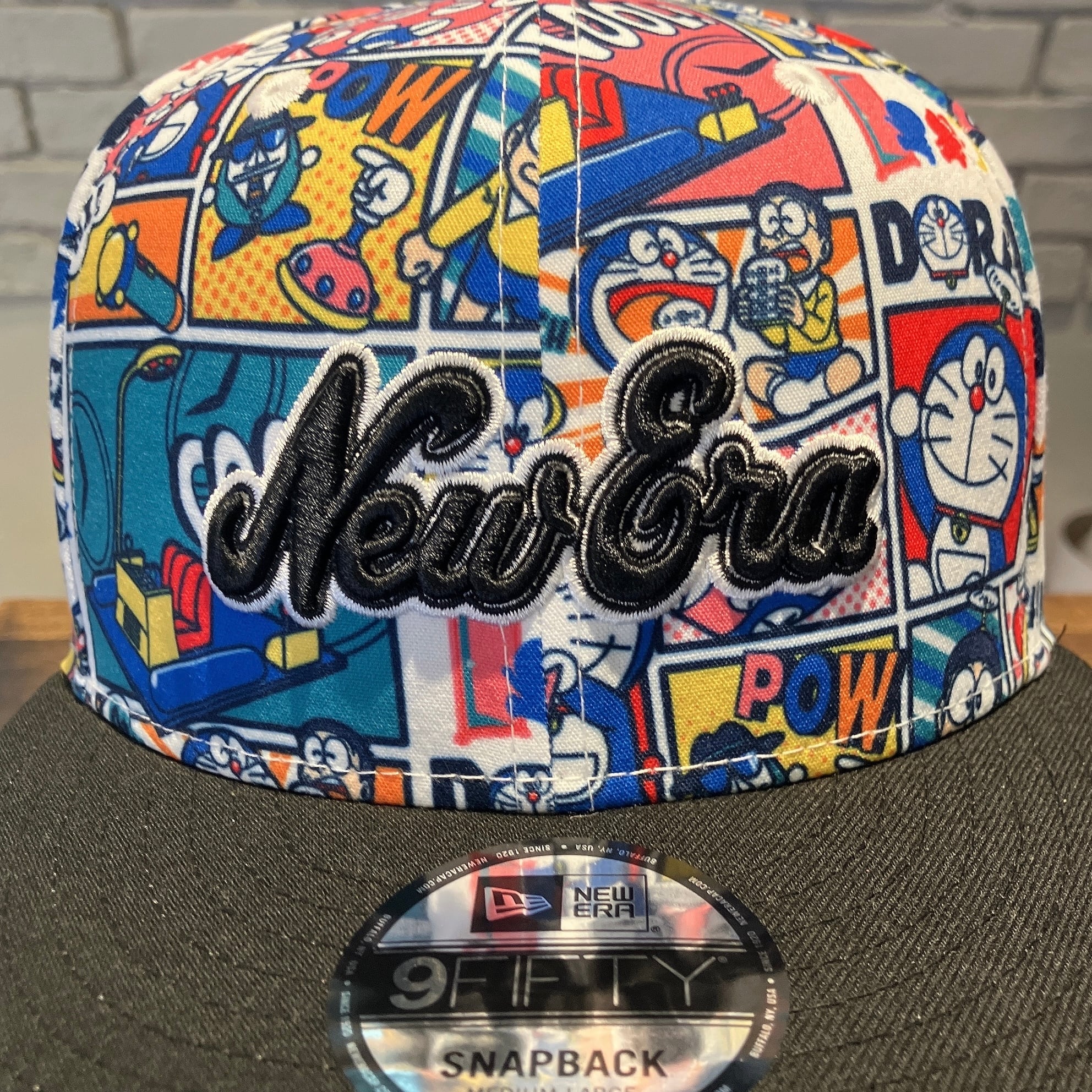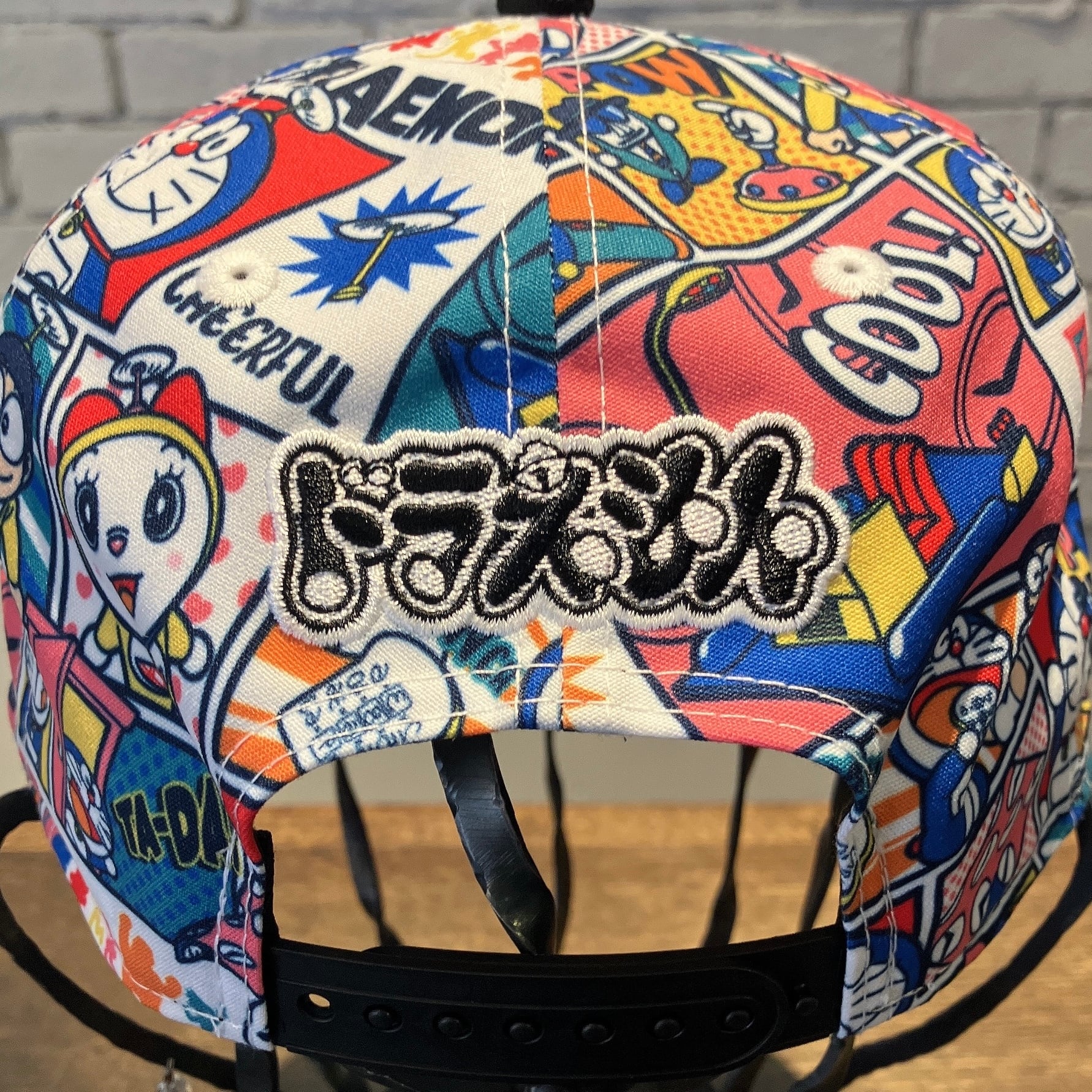 可愛らしい色合いでアメコミ風に描かれたドラえもんとその仲間たちや秘密道具を全面にプリント。