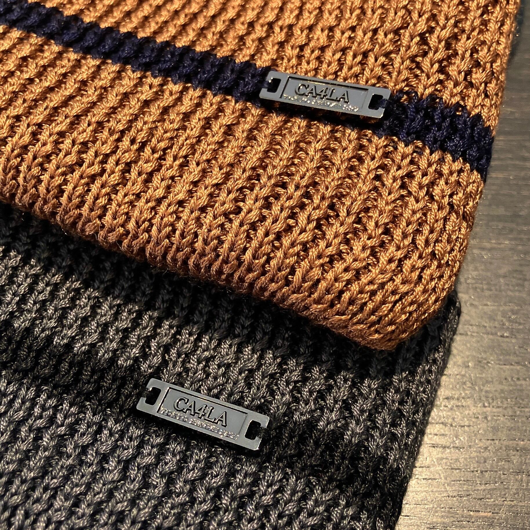 落ち着いたトーンのボーダー柄がポイントのデザイン。サイドにネームプレートを飾り、アクセントをプラス。