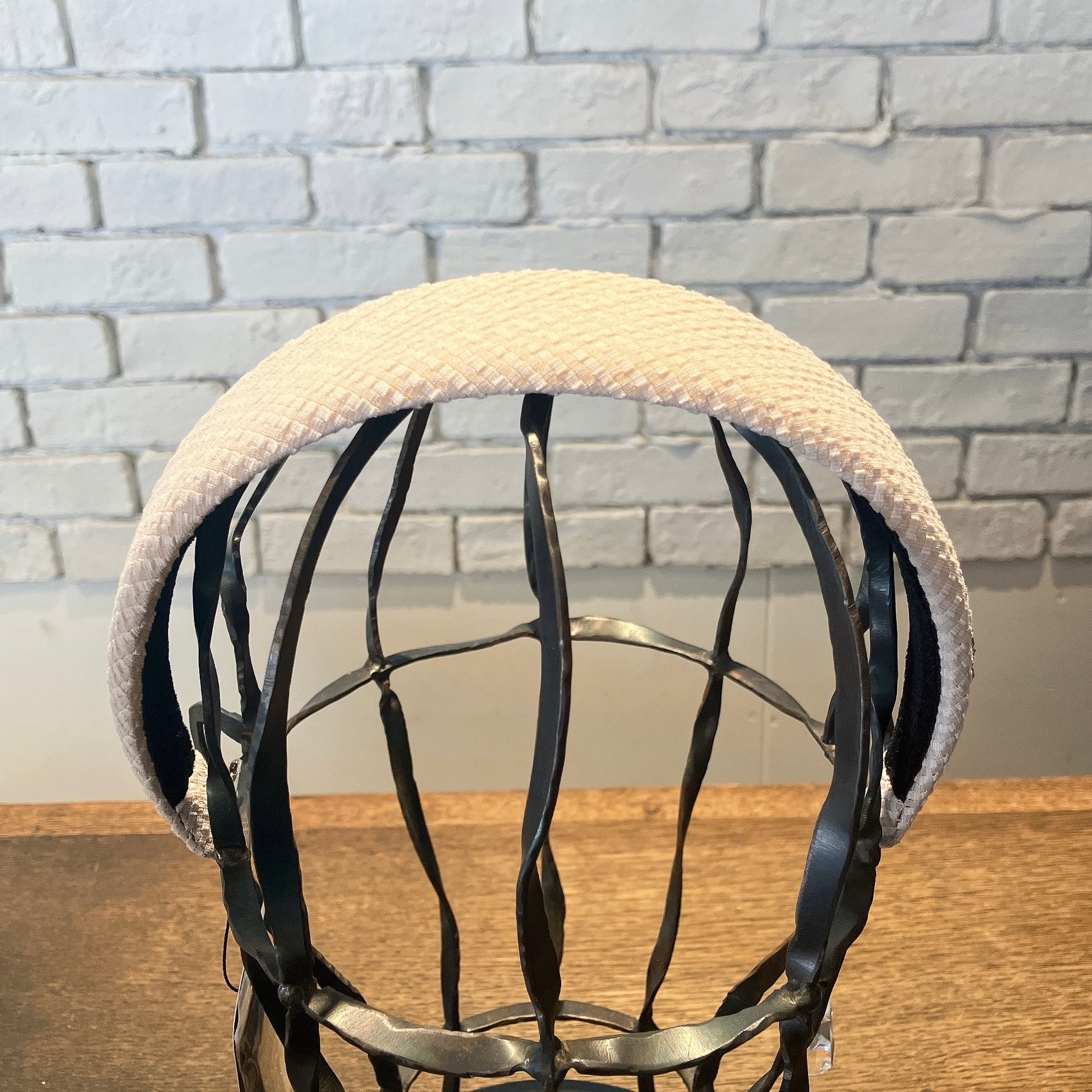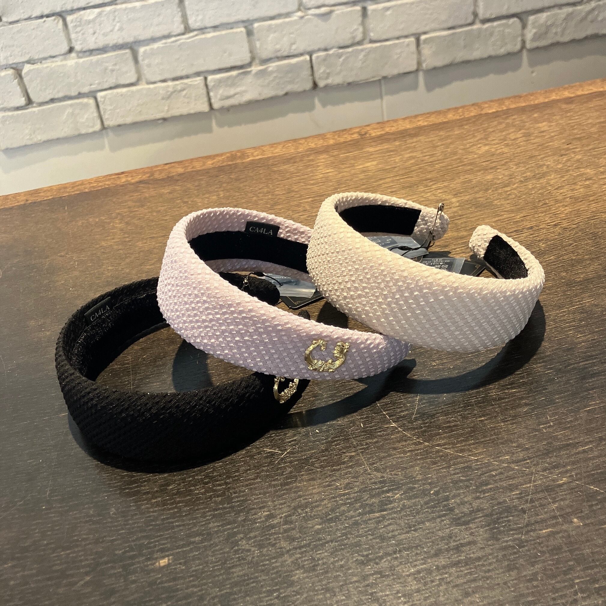 サイドにきらりと輝くCパーツを飾り付け。裏側はベルベットテープを当て、安定感のある付け心地に。
