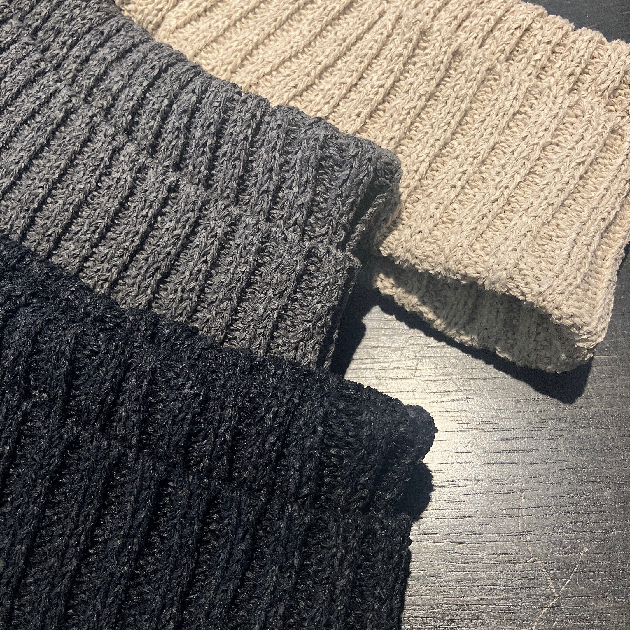 和紙糸とポリエステルをブレンドした、シャリシャリとした清涼感のある手触り。とても軽い付け心地で、熱い時期に嬉しい吸水性と速乾性があり、丸洗いも可能です。