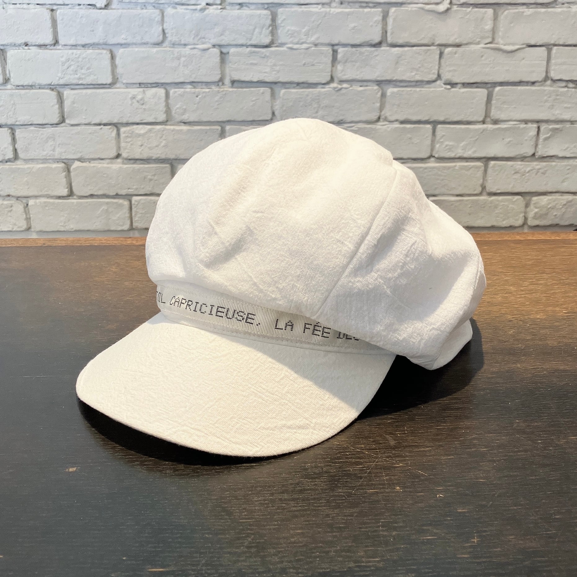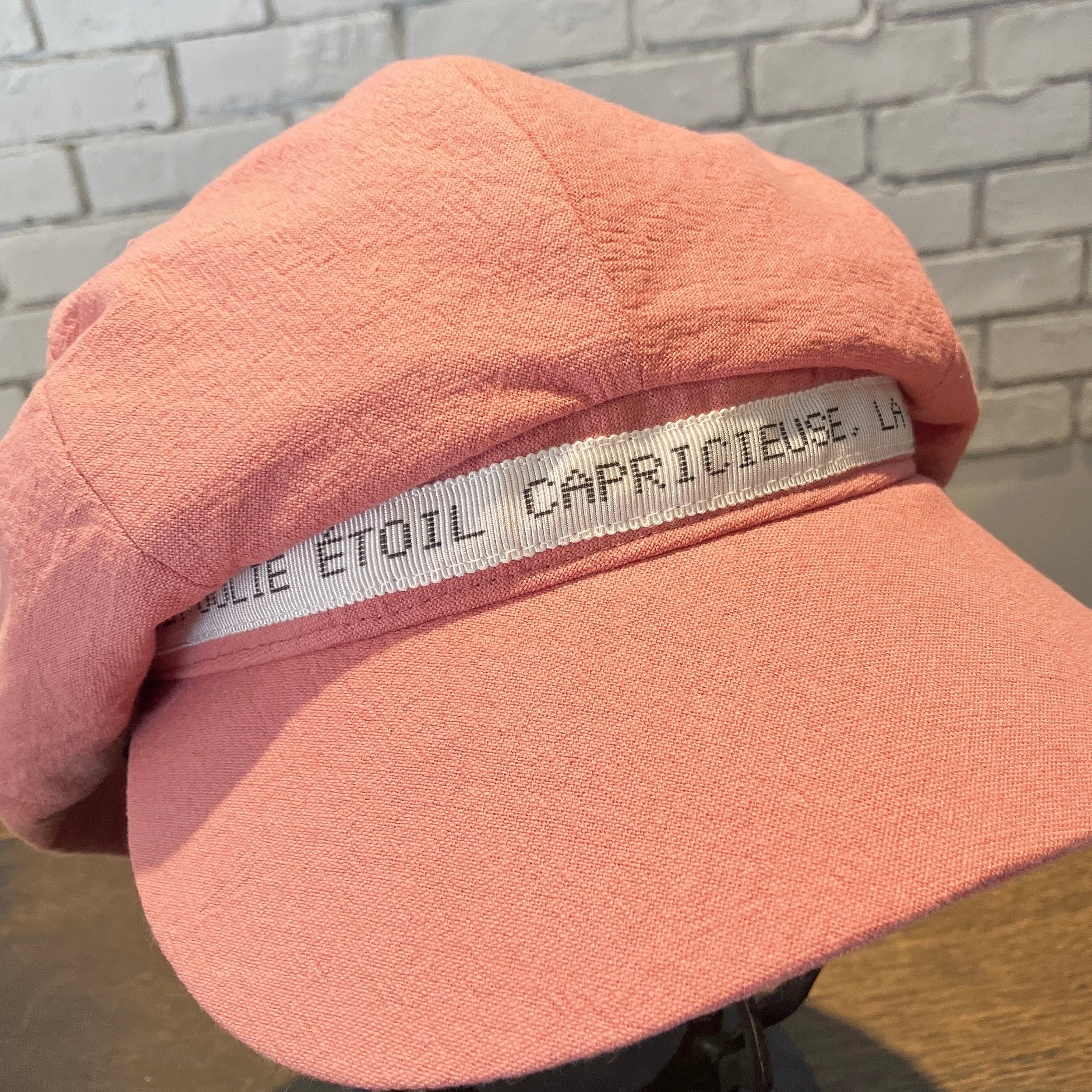 今回はいつものフレンチハンチング型に「腰」が付きました。フランス語が書かれたリボンが巻かれレトロな雰囲気です。