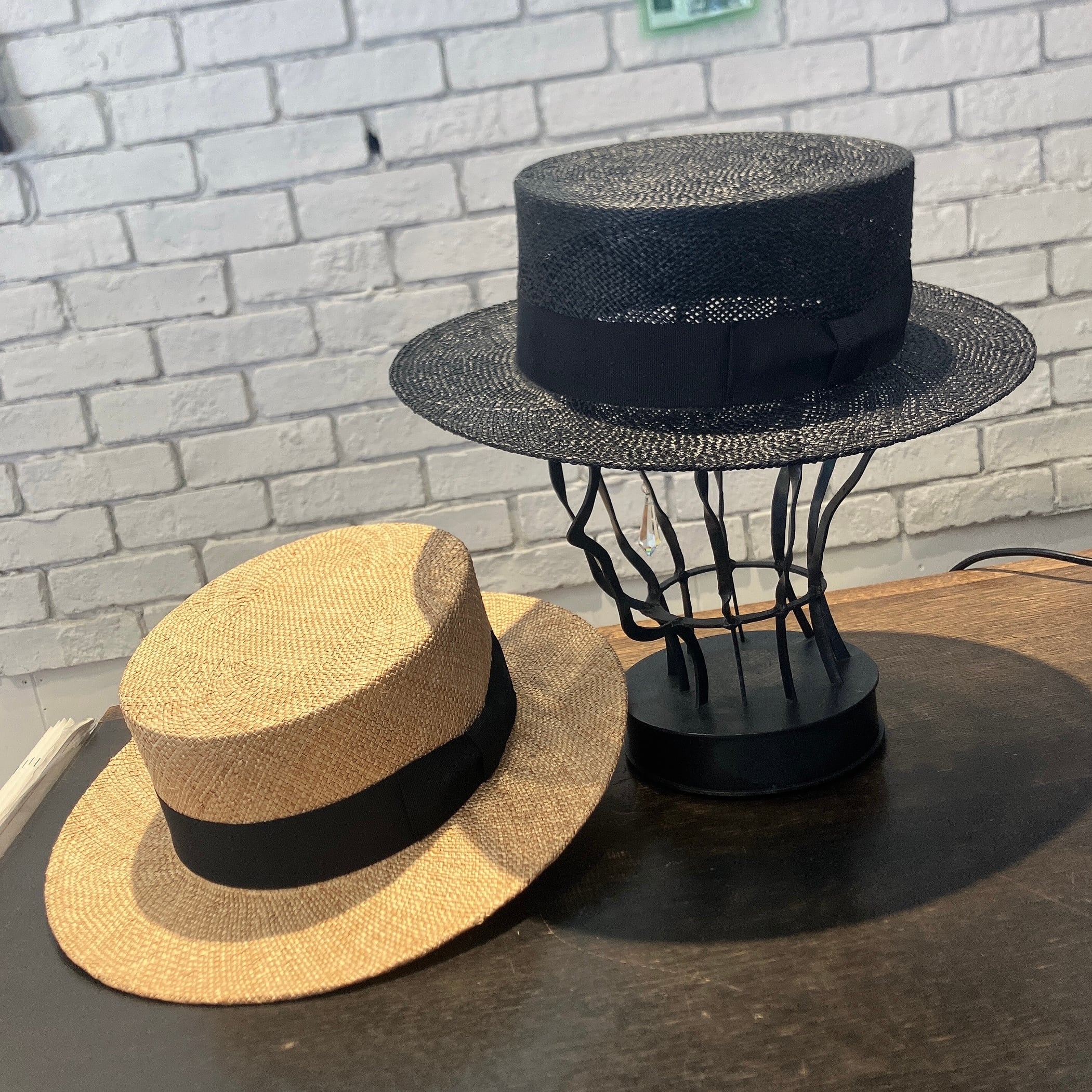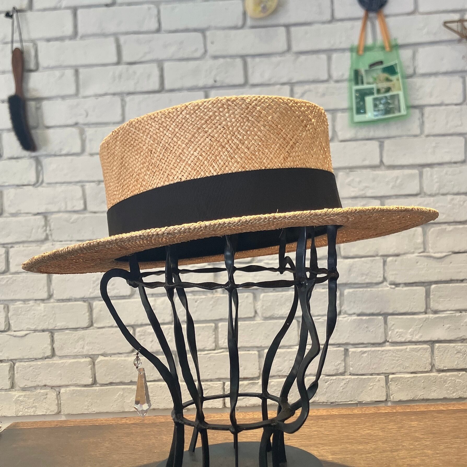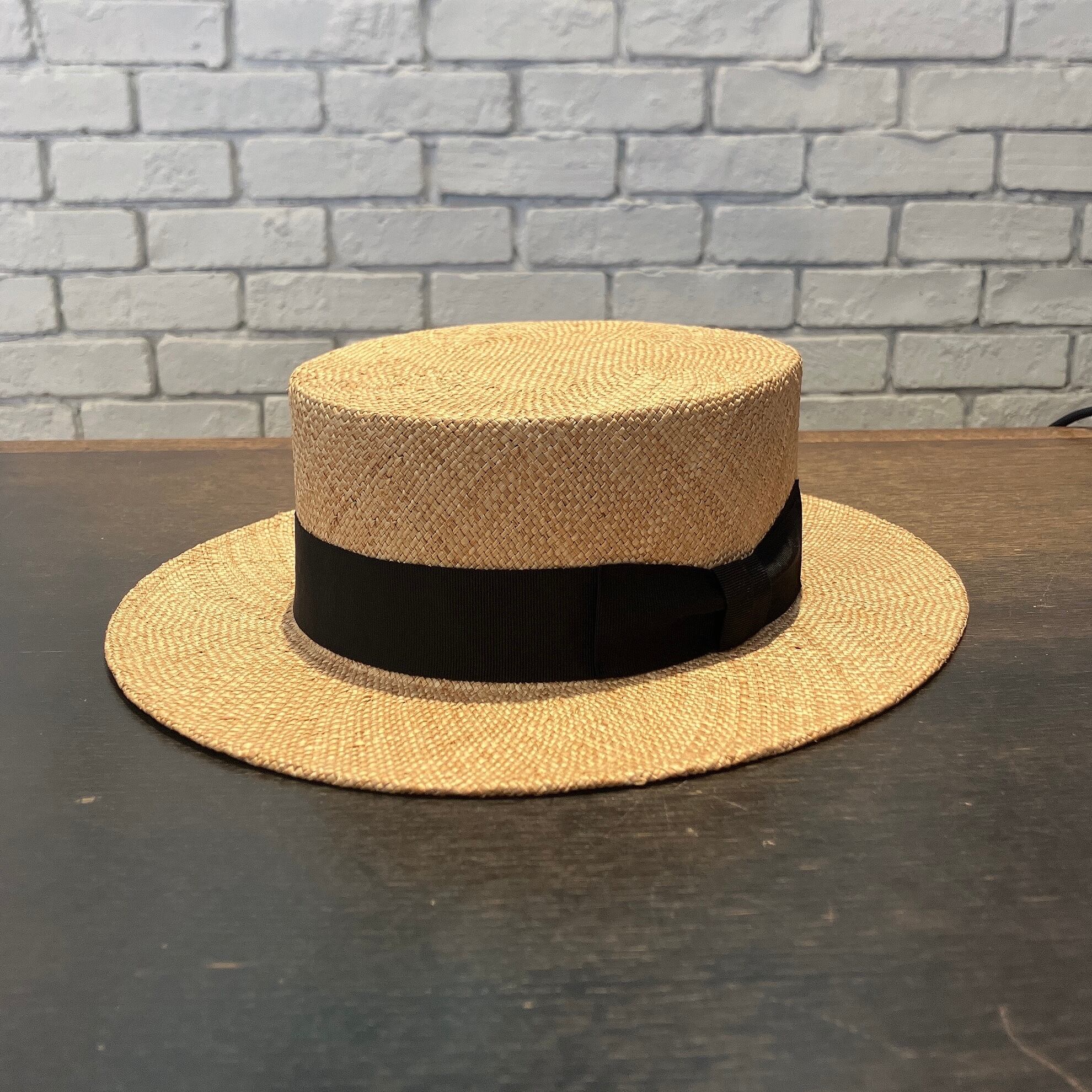 シンプルなリボン巻きに革スベリ仕様でクラシックに仕上げられています。基本的なカンカン帽より被りが浅い作りですっきりした印象です。