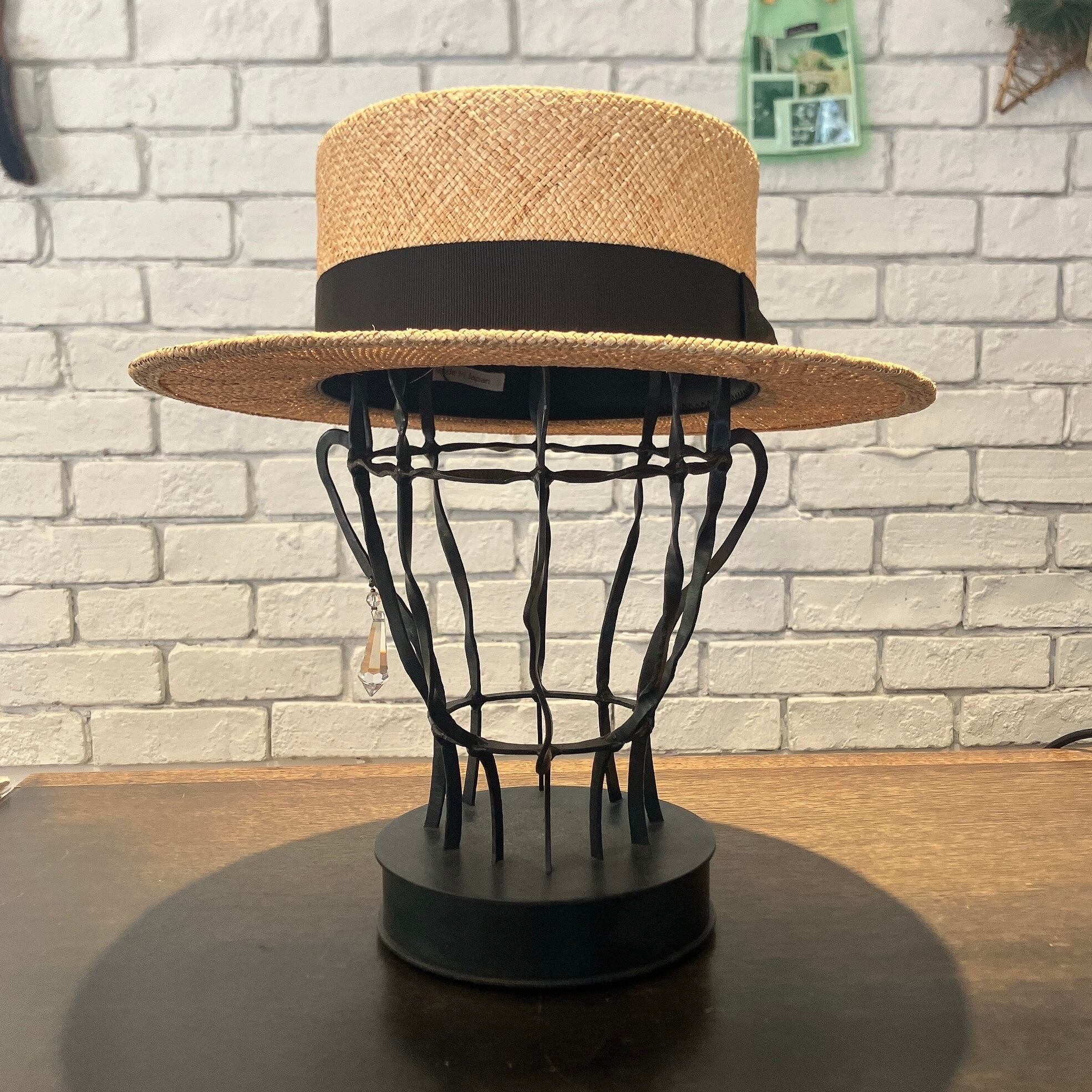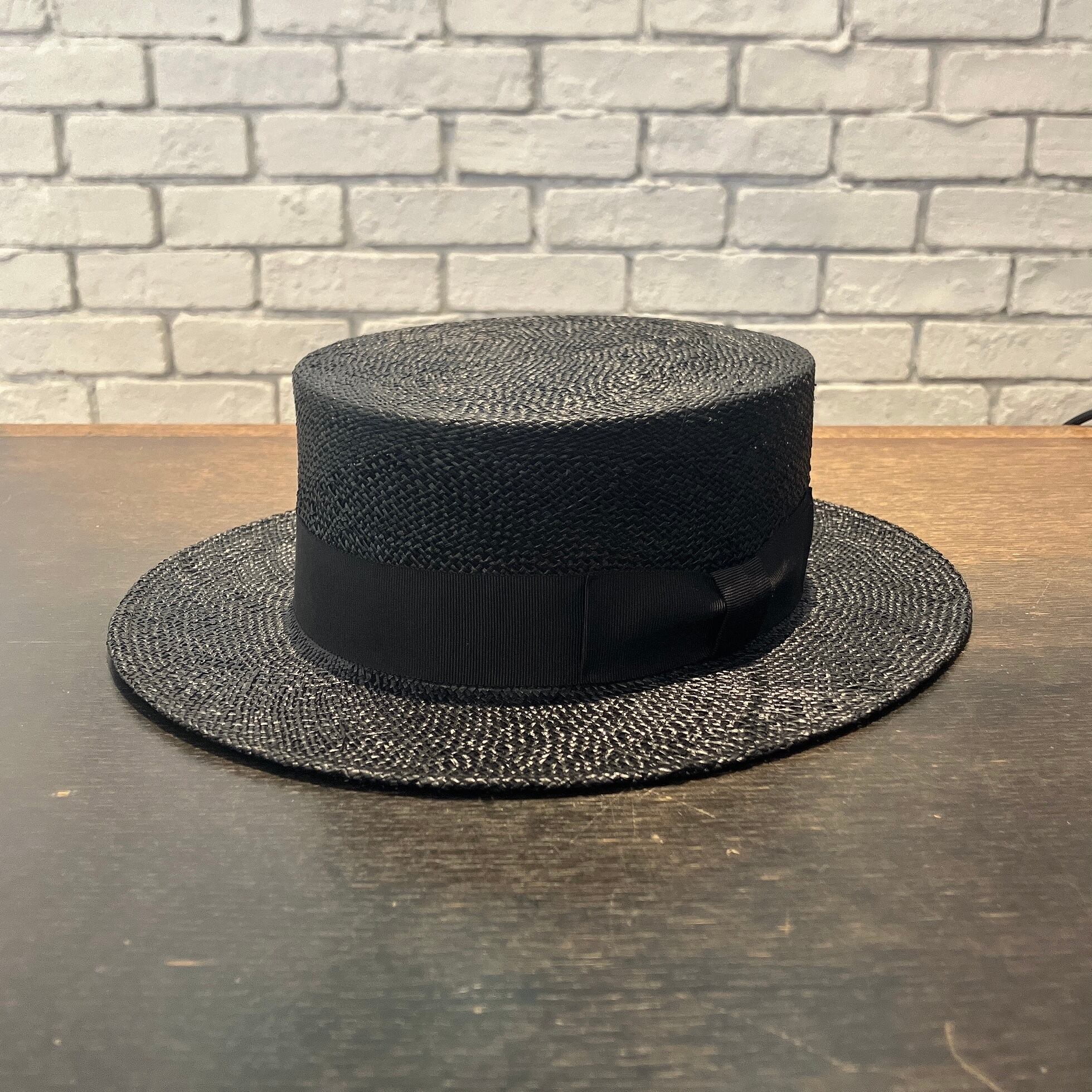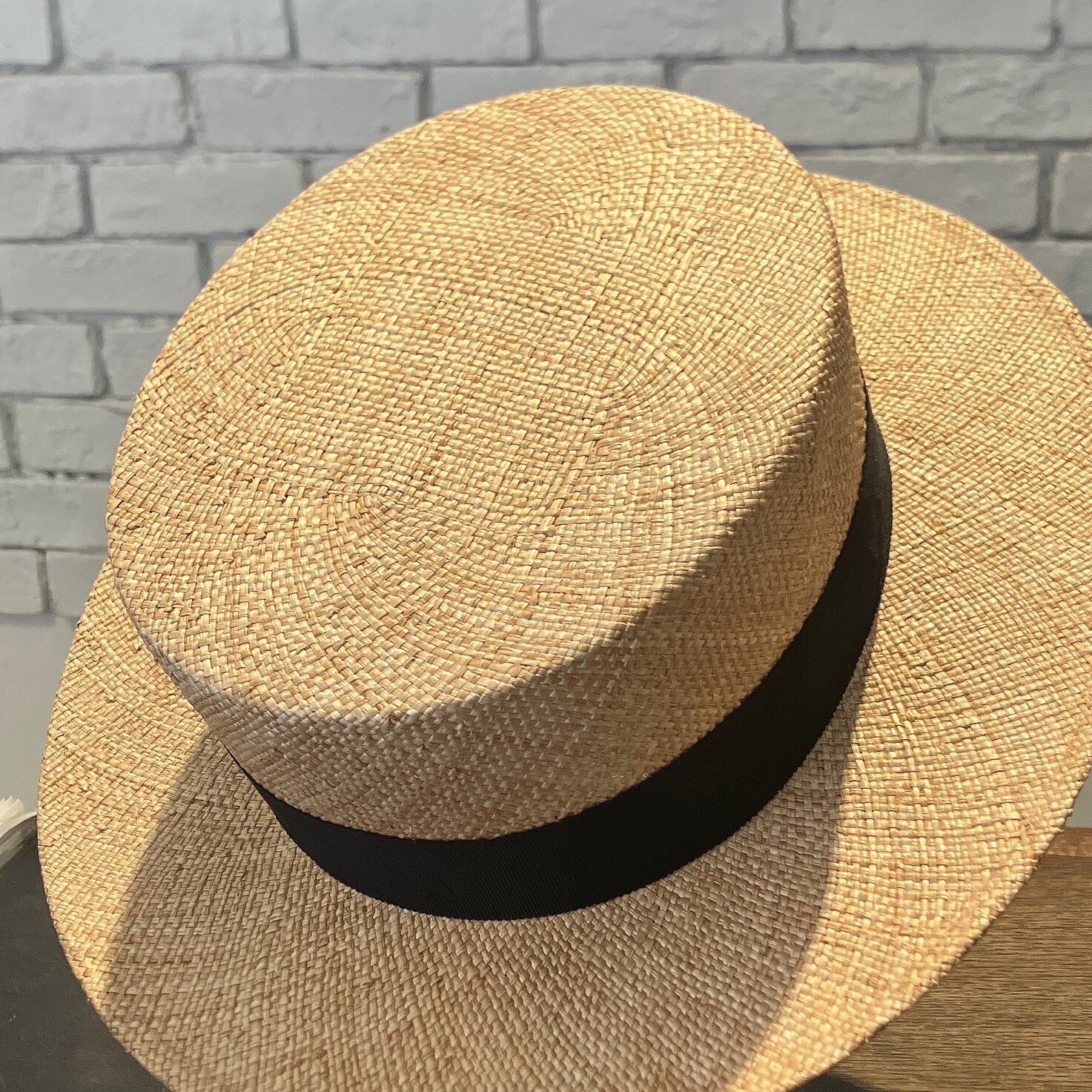 シンプルなリボン巻きに革スベリ仕様でクラシックに仕上げられています。基本的なカンカン帽より被りが浅い作りですっきりした印象です。