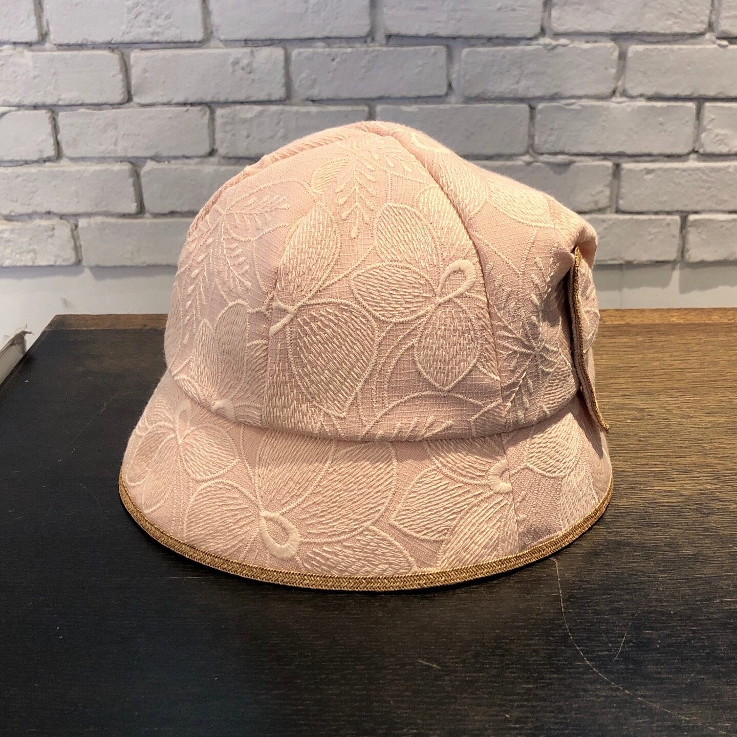 オリジナルの刺繍生地を使用し、コロンとした可愛らしいシルエットに仕上げました。後ろ側に切り替えとタックを入れたクラウンはかぶりやすく安定感◎。下向きブリムは日除けにも最適です。着物の帯をイメージした大きなリボンがポイントで、可愛らしさだけでなく上品さも演出してくれます。